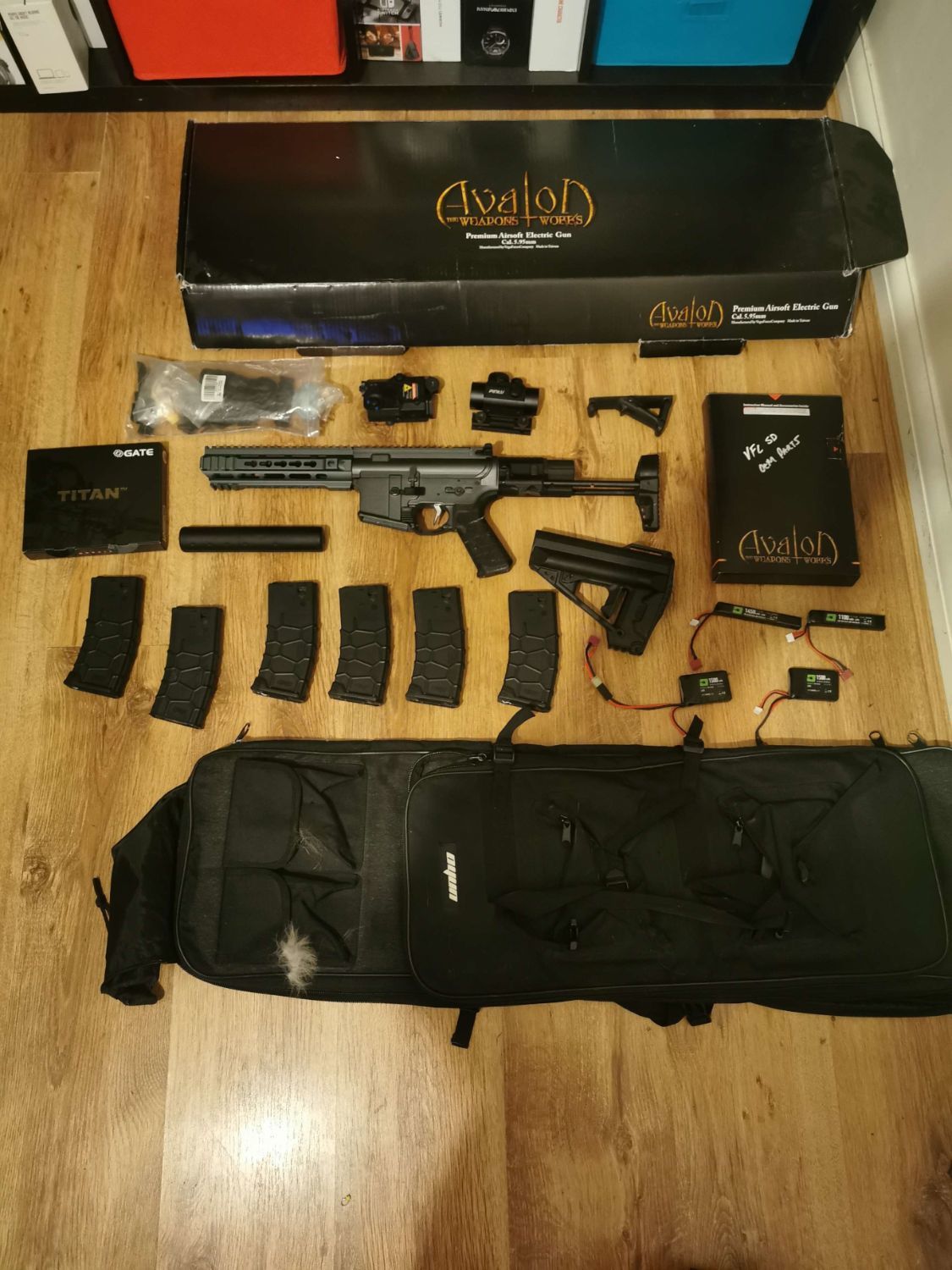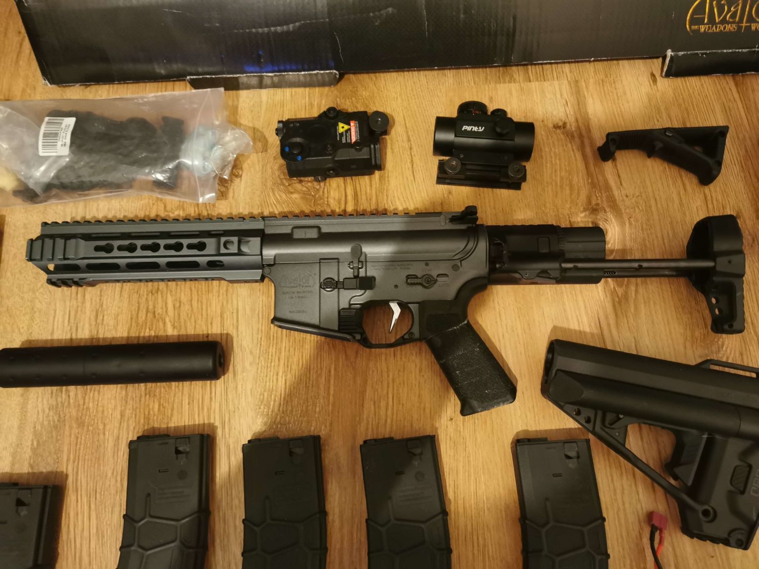 Comes with 6 QRS midcap mags. They hold 120 or 130 bbs cant remember tbh. All stock parts are included as u can see in the picture along with the manual etc. Also comes with an angled foregrip, working peq box with 4 modes + 1 off and a red dot sight with a riser too.