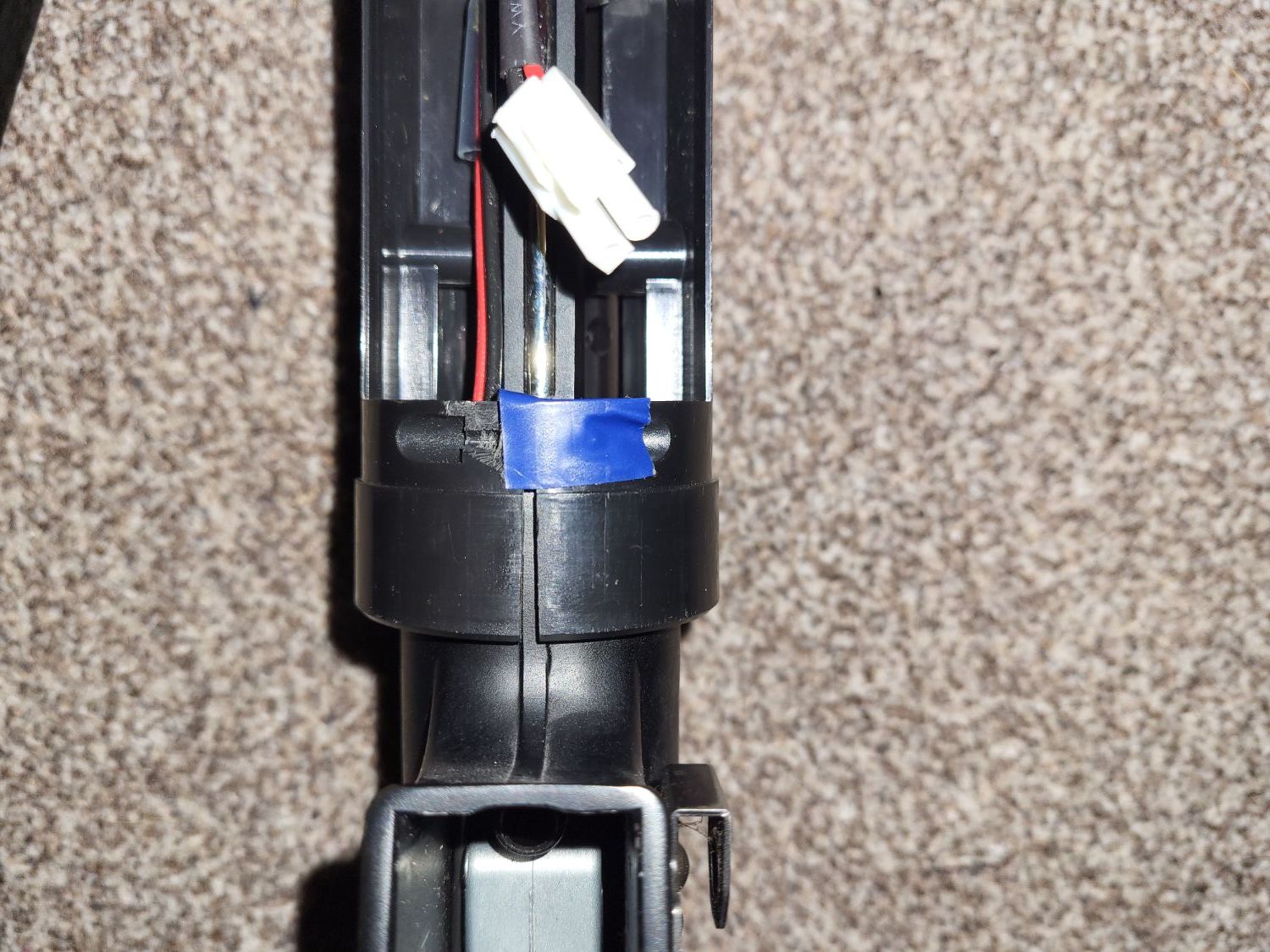 As I'd bet is standard with MP5s that have the battery compartment in the handguard, one of the pins that holds the cover on is missing.