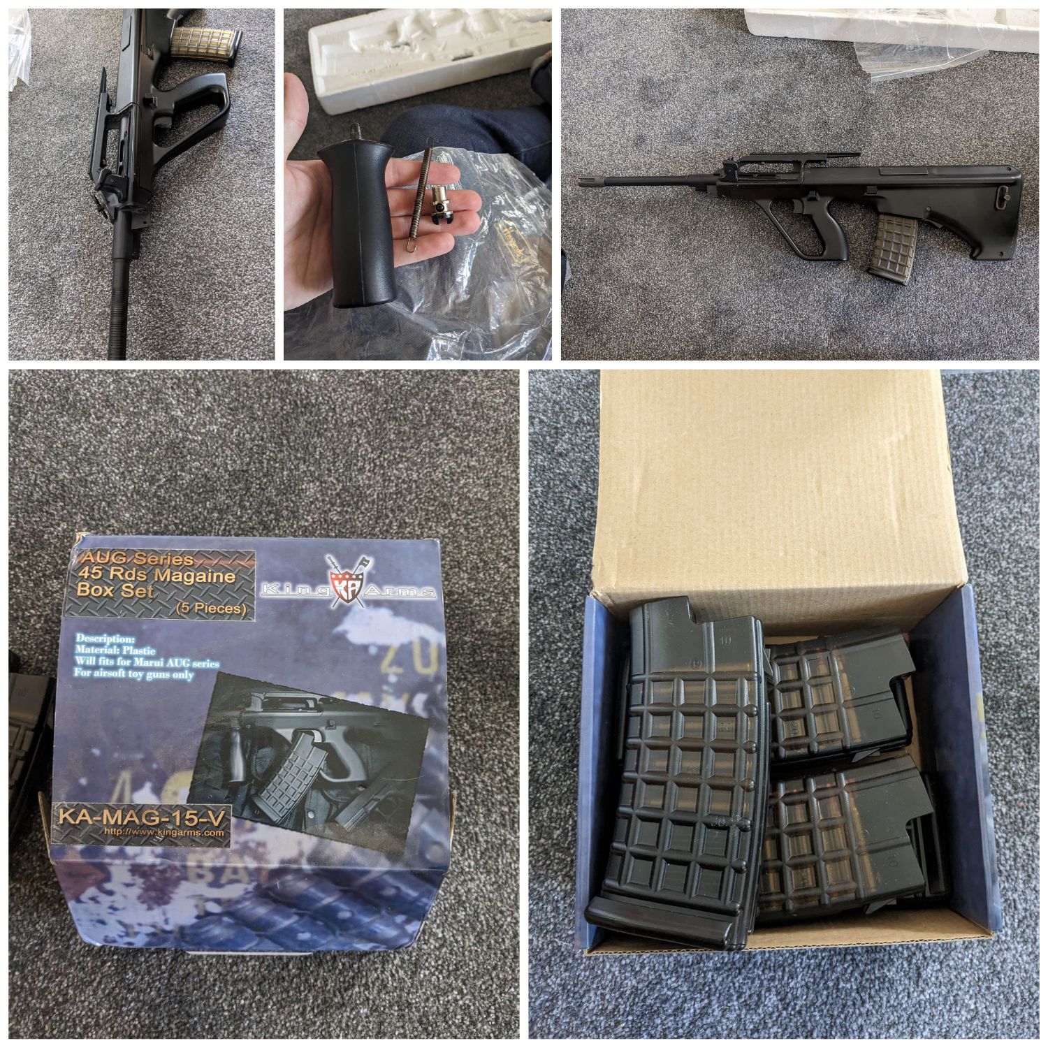 1. Tokyo Marui Aug A2 AEG. Well used and skirmished, lots of scratches etc. Broken foregrip that you see on so many TM Augs, and the little plunger thingy near the charging handle is loose (in the pic with the foregrip).  I used this a lot and never had any issues with it mechanically, I bought it second hand so have no idea if the internals are original, but they always worked well. Comes with 5 x 45 round King Arms real/midcaps and the original TM mag. No box.