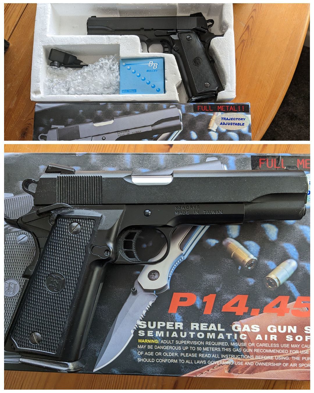 5. KJ Works Para-Ordnance P14-45 GBB. Full metal, worked well when I last used it a decade ago, but I know gas guns have rubber seals in various places so might need some work now. Main issue with it is the slide lock catch is loose, so it can fall out if the gun is fired at a certain angle, was never sure how best to fix it. Box.