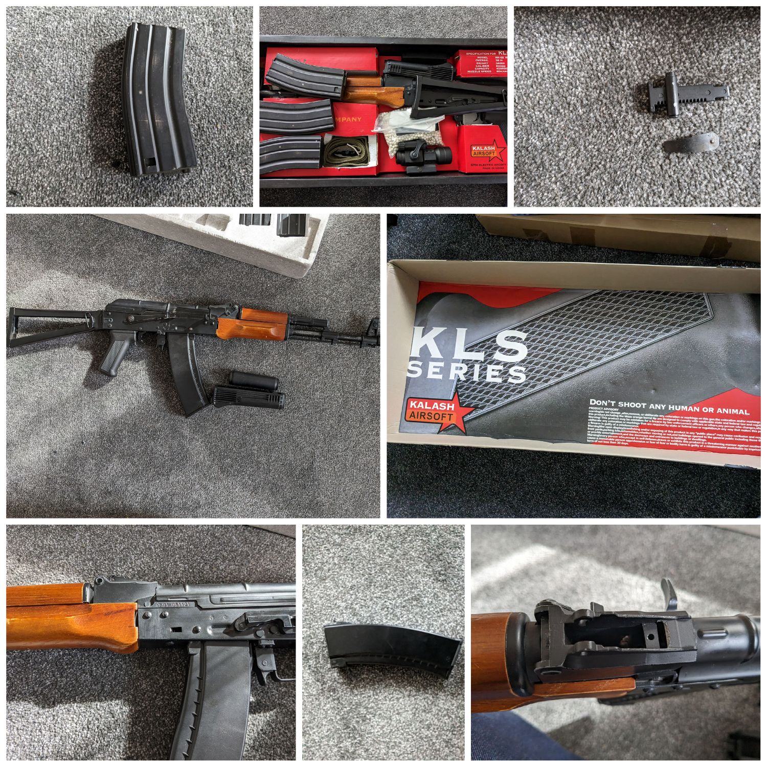 2. Kalash KLS series AKS-74 AEG. Full metal, wooden grips and spare polymer grips. Been aged a bit with wire wool in parts, the clip that locks the rear stock in place when folded is broken, as is the rear iron site. From memory this cycled and fired, but never all that well - didn't seem accurate at all, I remember having a plan to upgrade the internals but never got around to it. Two mags. Box.