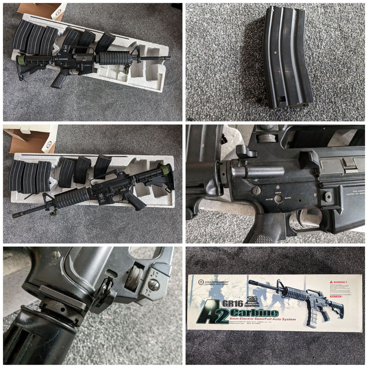 4. G&G M16 Carbine AEG (actually not sure what model this is, it's not an M4 as it doesn't have a removable carry handle, but doesn't match a CAR-15 exactly either). Really love the aesthetics and quality of this one, full metal (magnesium I think) really nice rough textured nylon polymer grips, scratches and aging just seem to make it look better. BUT the internals have always been bad. Will need a full gearbox rebuild, and you'll need to replace/fix the charging handle which is missing some parts and only attached by a spring, and the little round piece on the other side of the fire selector switch (which also needs looking at as it's mushy). Fortunately Armalite parts are never in short supply! 6 metal mags, not sure about the brand. Also comes with a metal RIS rail that can be attached to the carry handle (in the picture with all the other gear above the speed loader and goggles. Box.