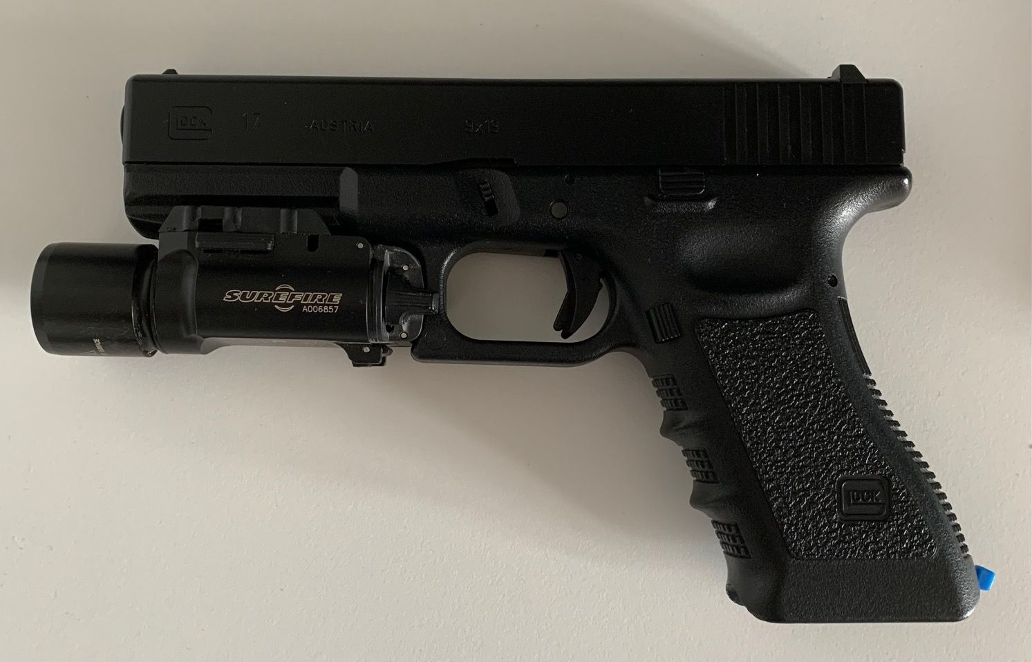 This is a genuine Safariland product to fit a Glock 17 handgun with or without a flashlight mounted. I’ve owned it from new, it’s never been out the house so never been skirmished as so it’s in like new condition. Pictured along with the holster is my TM G17 with an imitation Surefire X300 Weapon Light that is a perfect fit in this holster. TM G17 and flashlight are not included in this sale.