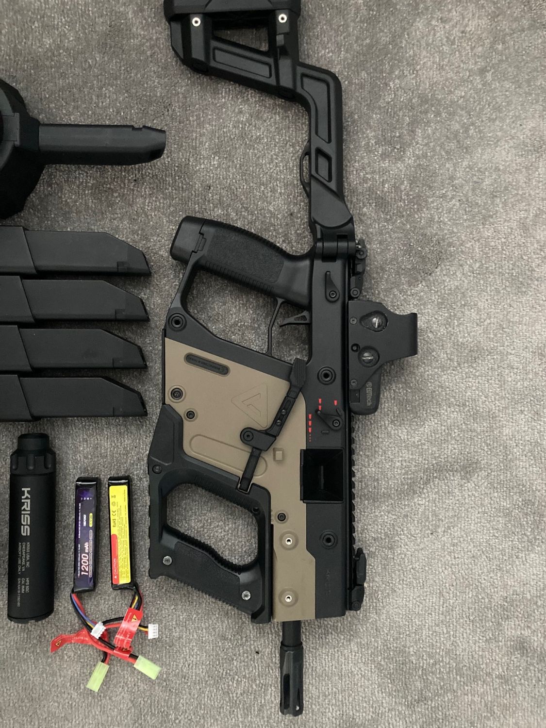 Krytac Kriss vector. Brilliant weapon extreamly accurate. Only selling as I’ve seen something else I want so need the funds. Gun comes 8 mid cap mags, Laylax nitro hand guard, laylax fast mag release, laylax trigger upgrade, m120 spring upgrade Kriss suppressor, 2 batteries. All also will be in the original Krytac box. Drum mag in the picture does not come with bundle. Any questions please feel free to message. Collection Norfolk or will post.