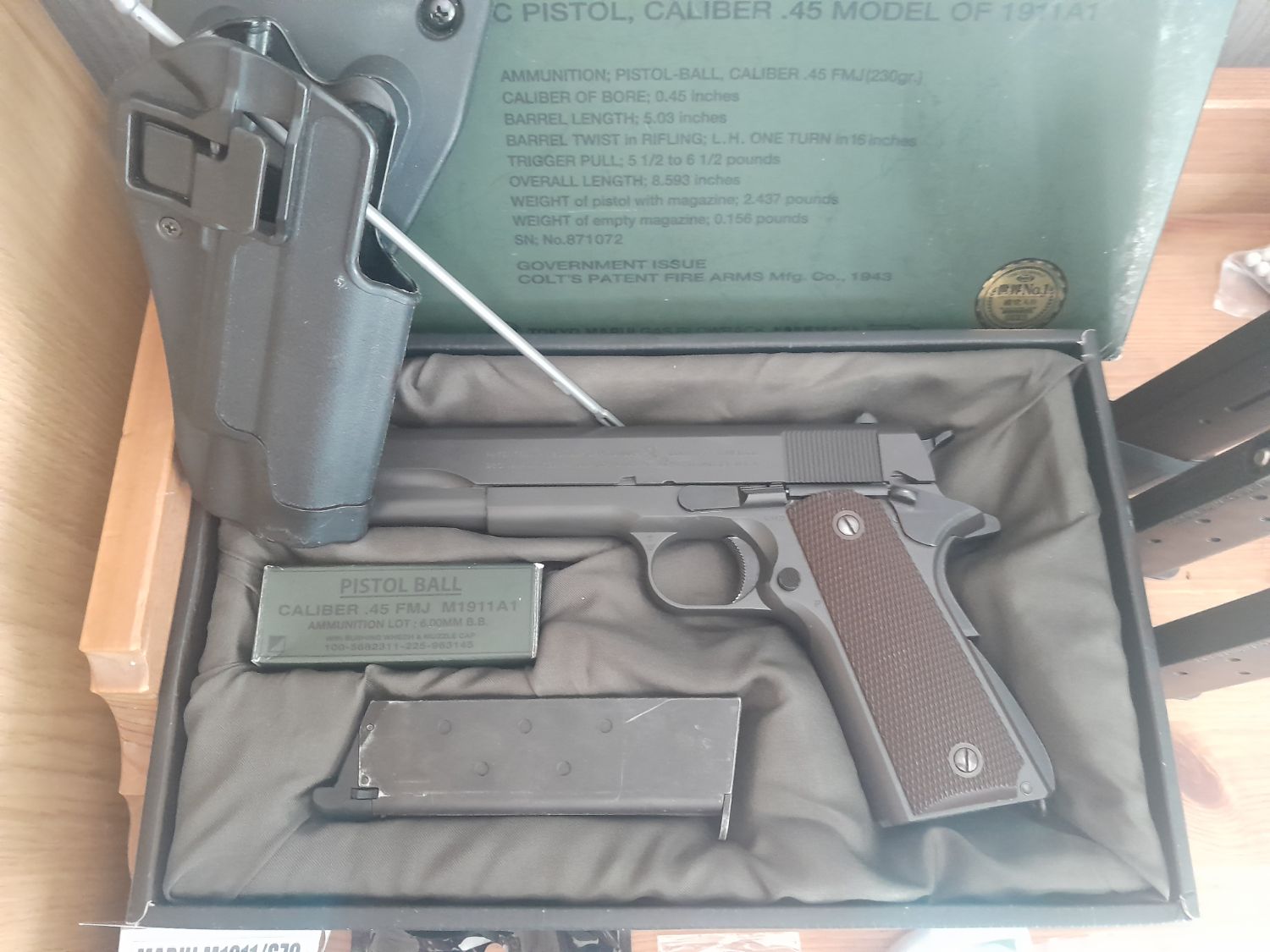 TM m1911 gbb, upgraded outer metal barrel and chamber, mag release, and slide catch,all steel gaurder. Feels absolutely stunning in the hand with the weight. Shoots brilliant comes with 4 mags, 3 are working, one will need a new fill valve for it, one mag is brand new.Willing to post, price includes postage, open to offers. Comes will all original parts