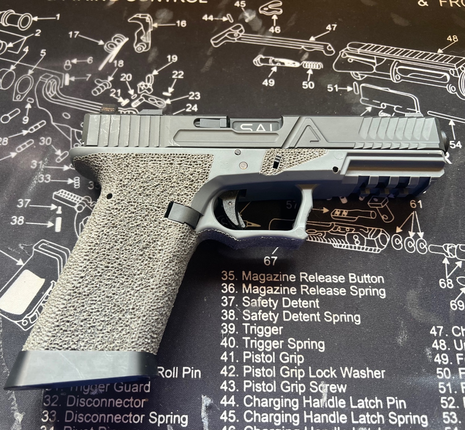 So we have a custom glock - I’ve put it together. To be honest it’s not feeding correctly and I don’t have the time to play around. JDG lower, SAI barrel and agency arms slide with real trijicon sights. TM/WE inners - comes with no mag. Looking for £160 plus postage