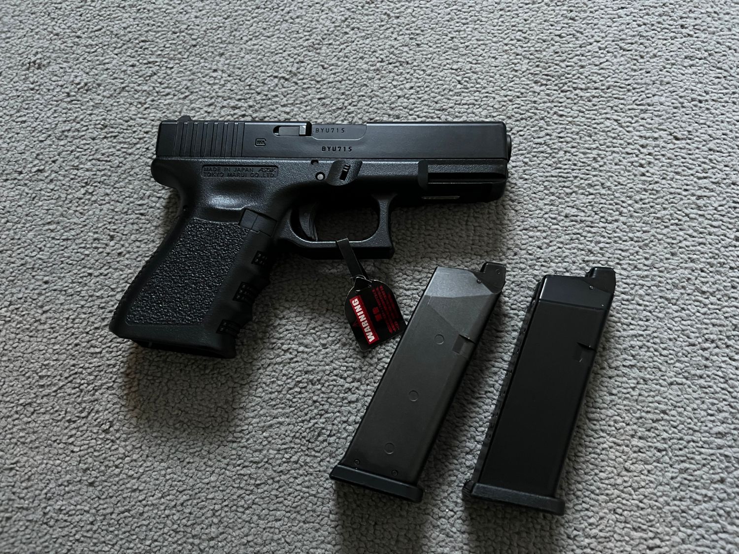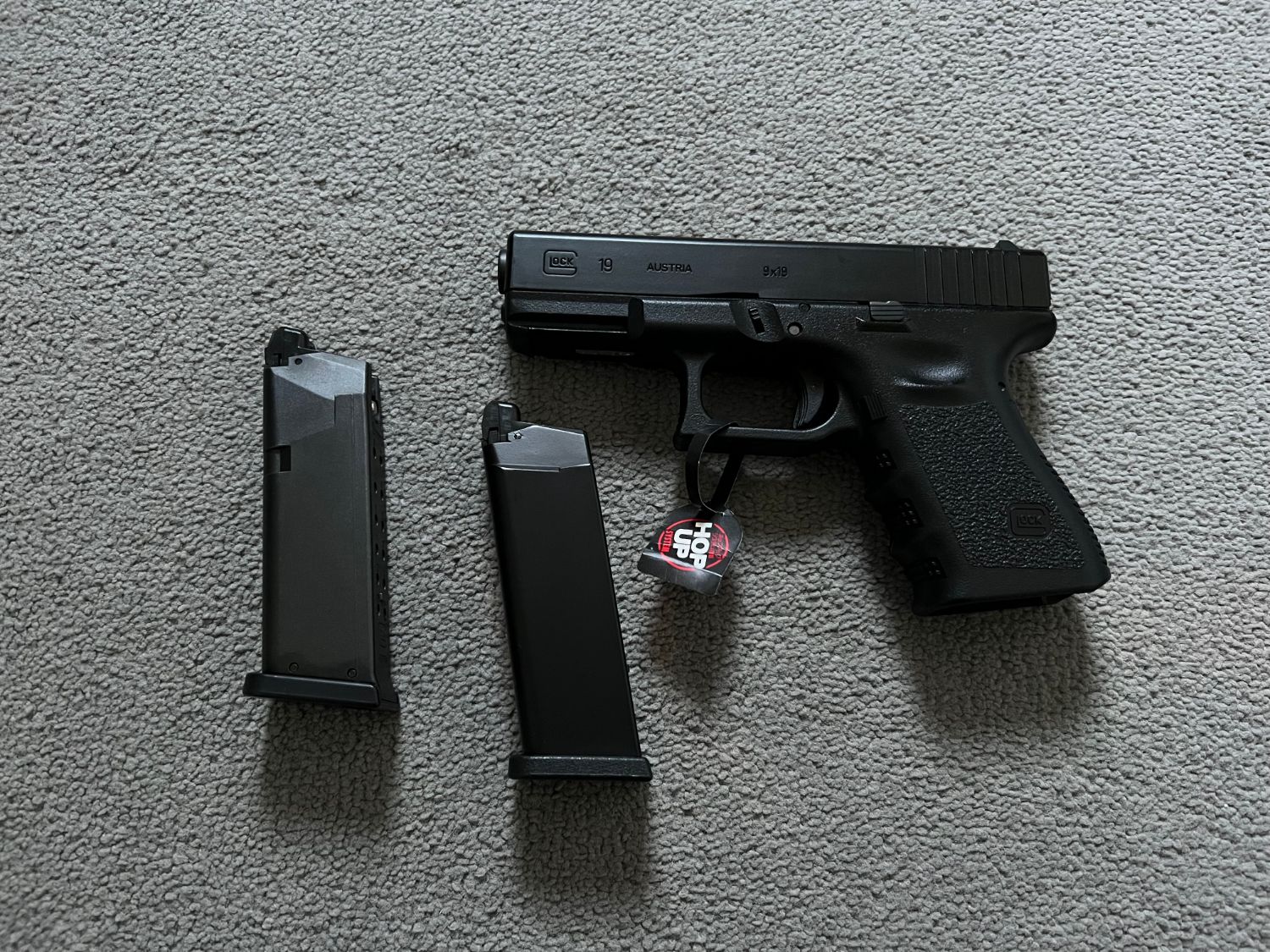 Tokyo Marui glock 19 gen 3. This RIF has seen barely any use as can been seen from the photo's (it's like brand new). Took it to a couple of game days where it stayed in it's holster most of the time. Selling as I am moving away from airsoft.