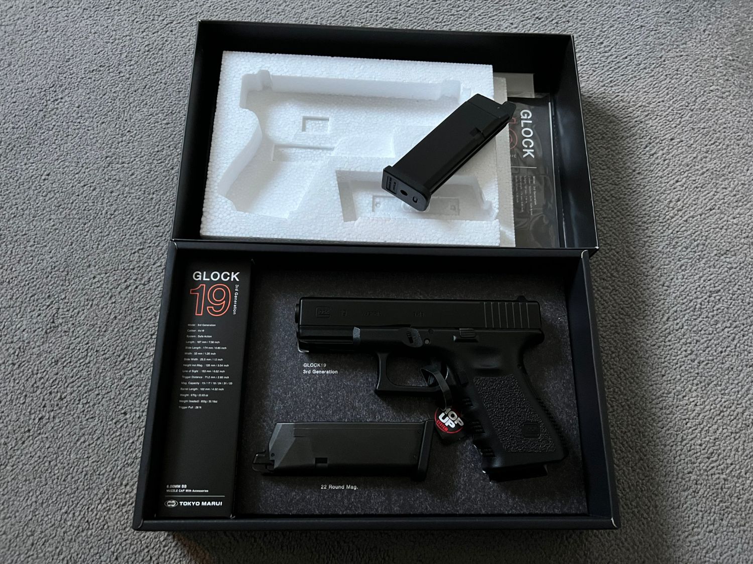 Comes in original box and includes two leak free glock 19 gas magazines (1 TM and one WE). Both mags have always been stored with maintenance gas but will obviously be discharged before posting out.