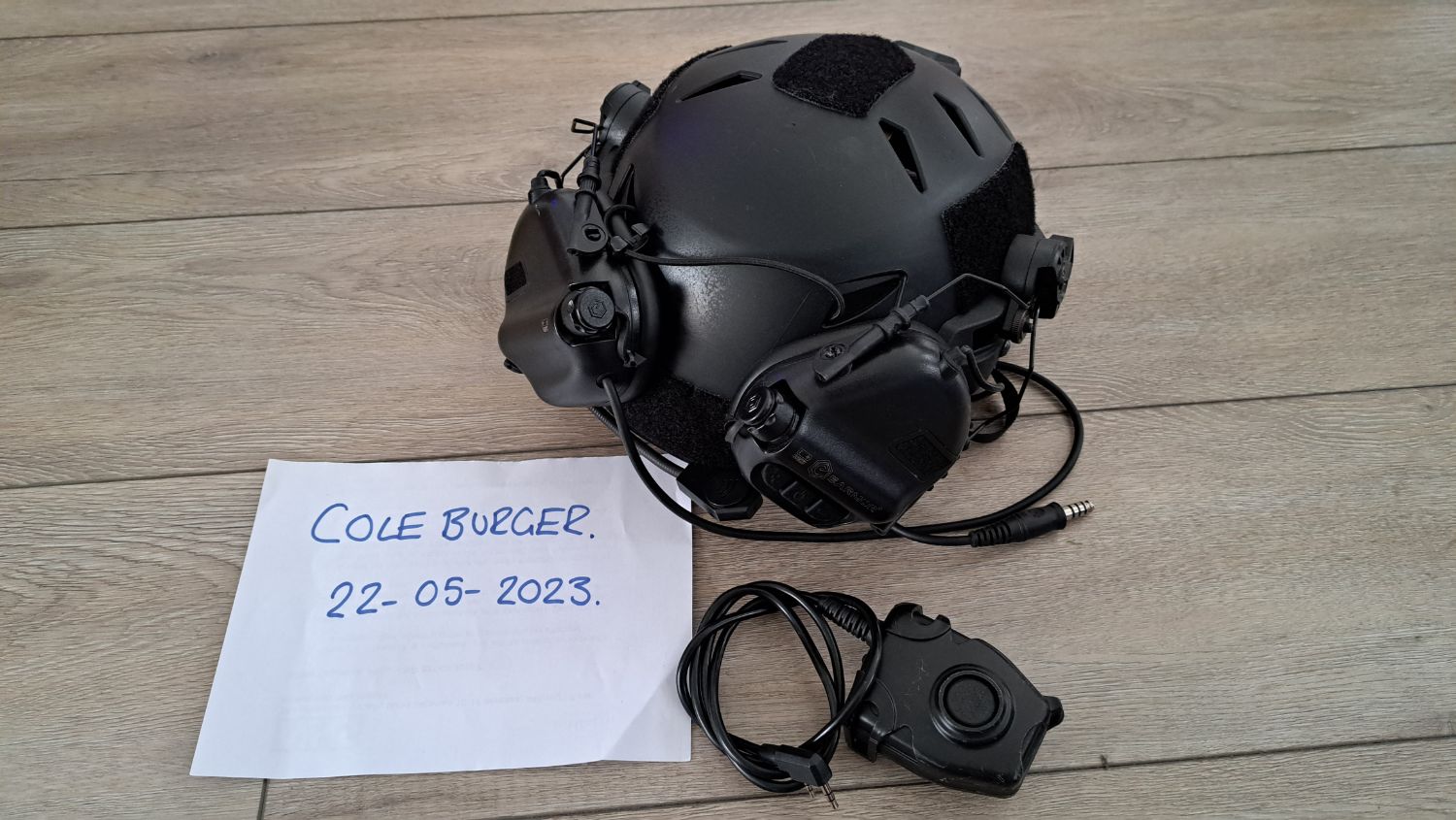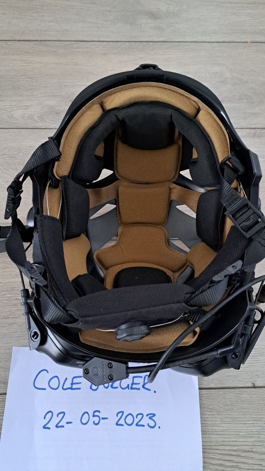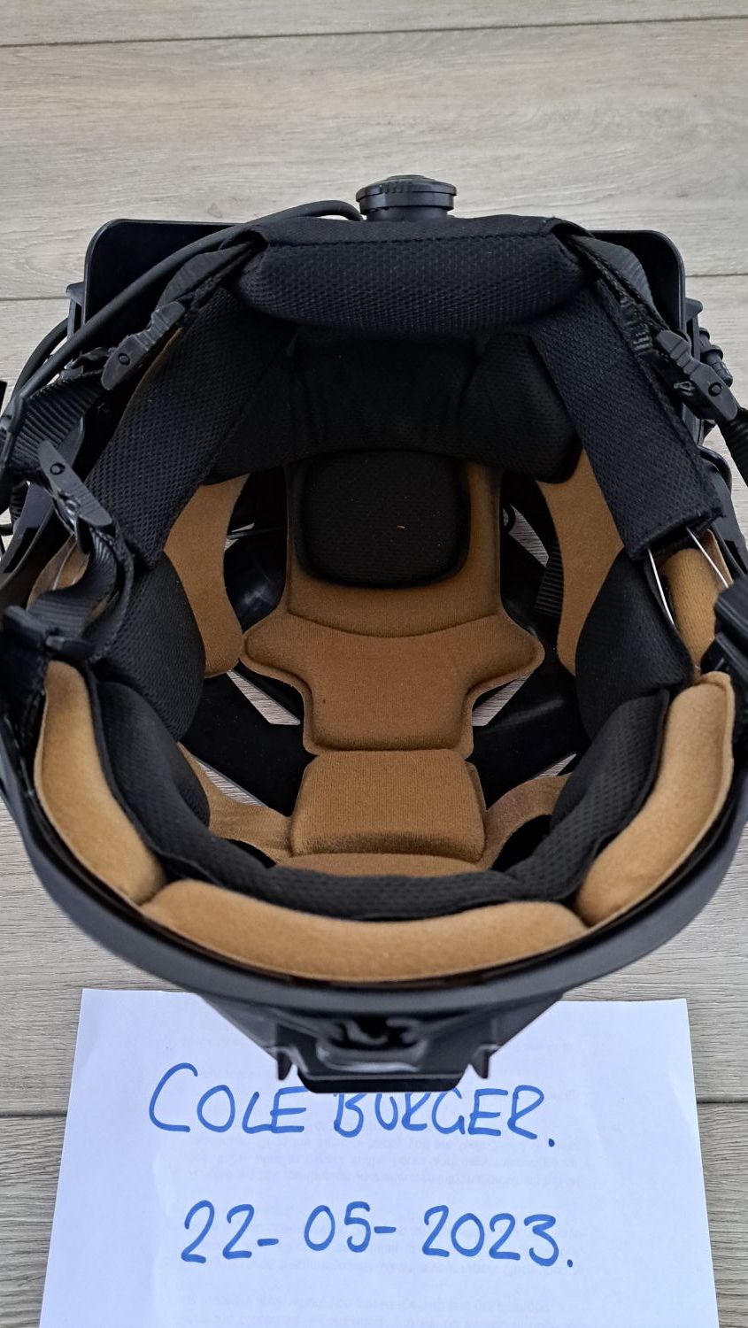 Bought new and used a handfull of times, the FMA helmet is the most comfortable I have worn with the memory foam inserts which are all removeable and washable. Mounted is a set of EARMOR M32's on EARMOR mounts.  Also with the sale will be the EARMOR PTT with remote wired PTT button - Not the PTT pictured as that is the wrong one.