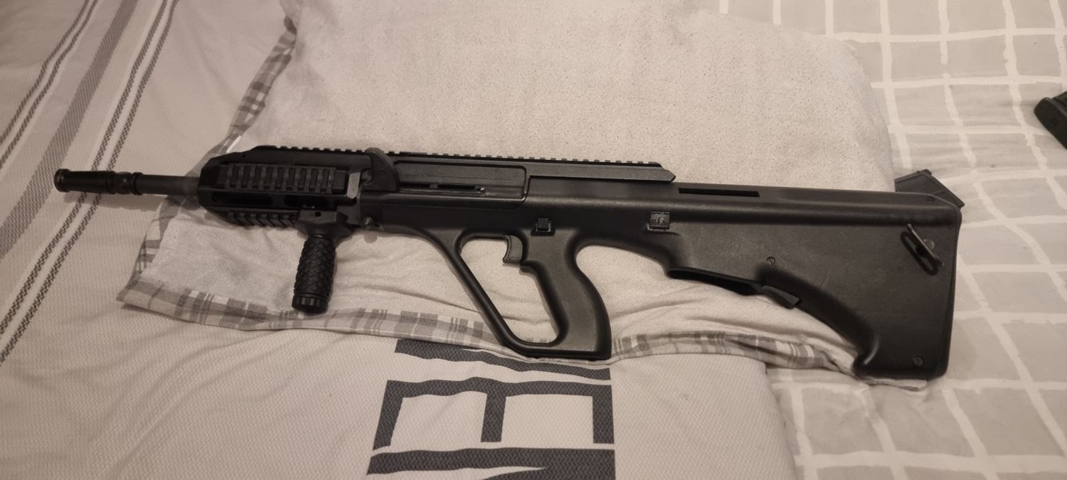 Hi guys I have a ghk aug here with a a3 kit, it comes with 4 mags, an a2 length barrel and a a2 foregrip too. Alot of mods have been done for smoother shooting experiences alot of which you can find in this video.
