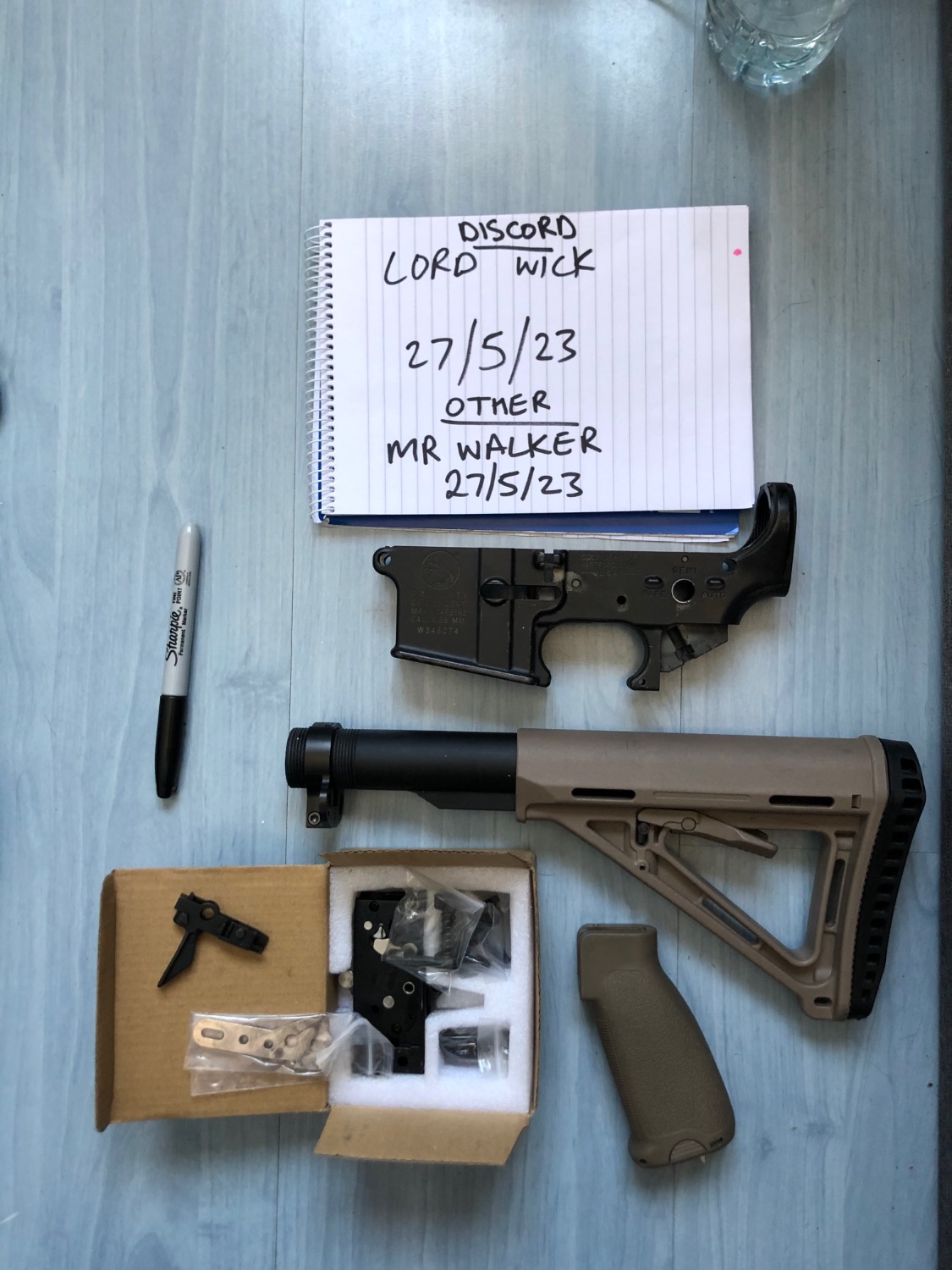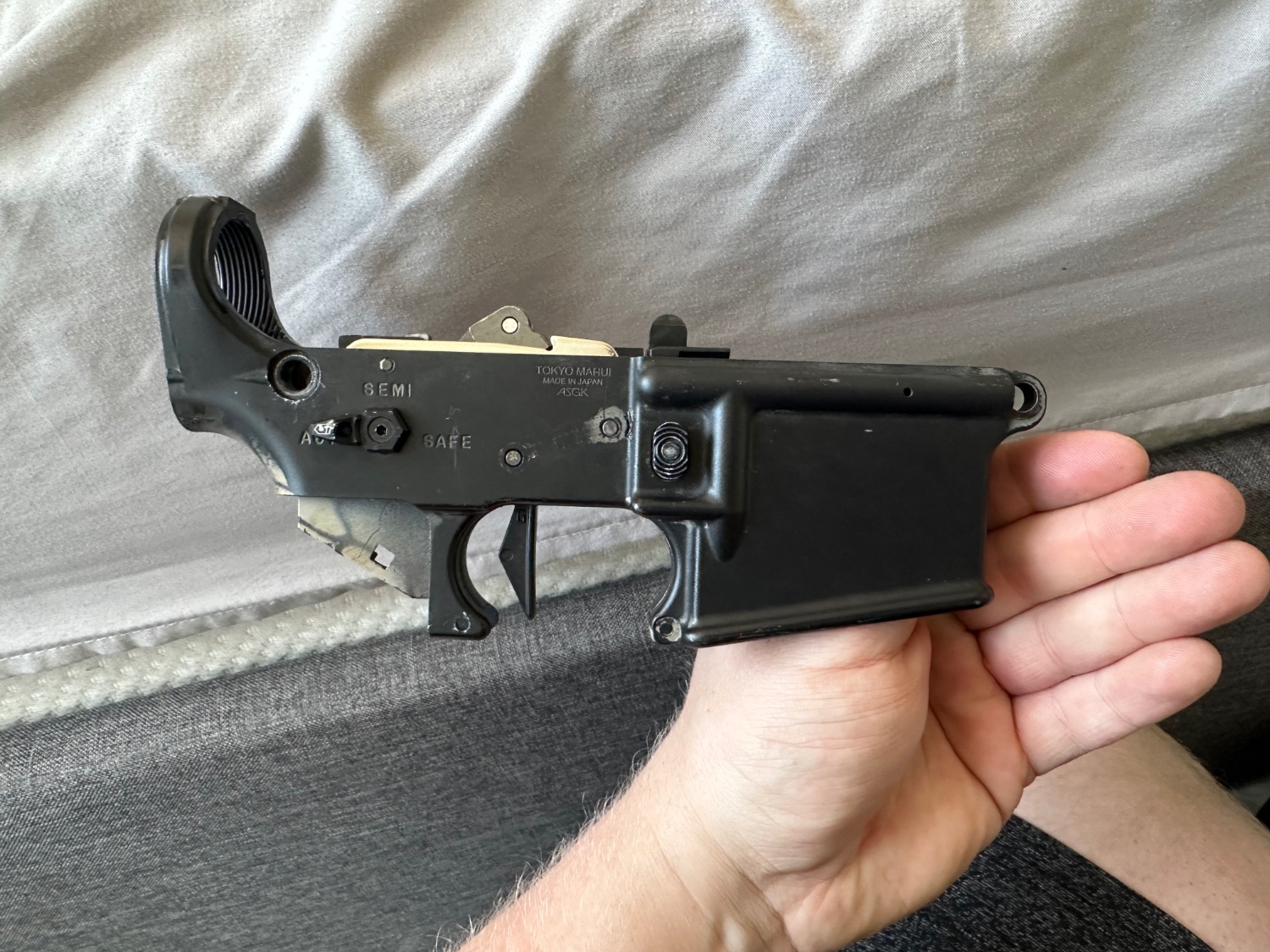 Stock Trigger box but has a GM G style flat trigger, stock buffer tube and spring but no buffer, clone MOE stock and clone BCM grip in tan.