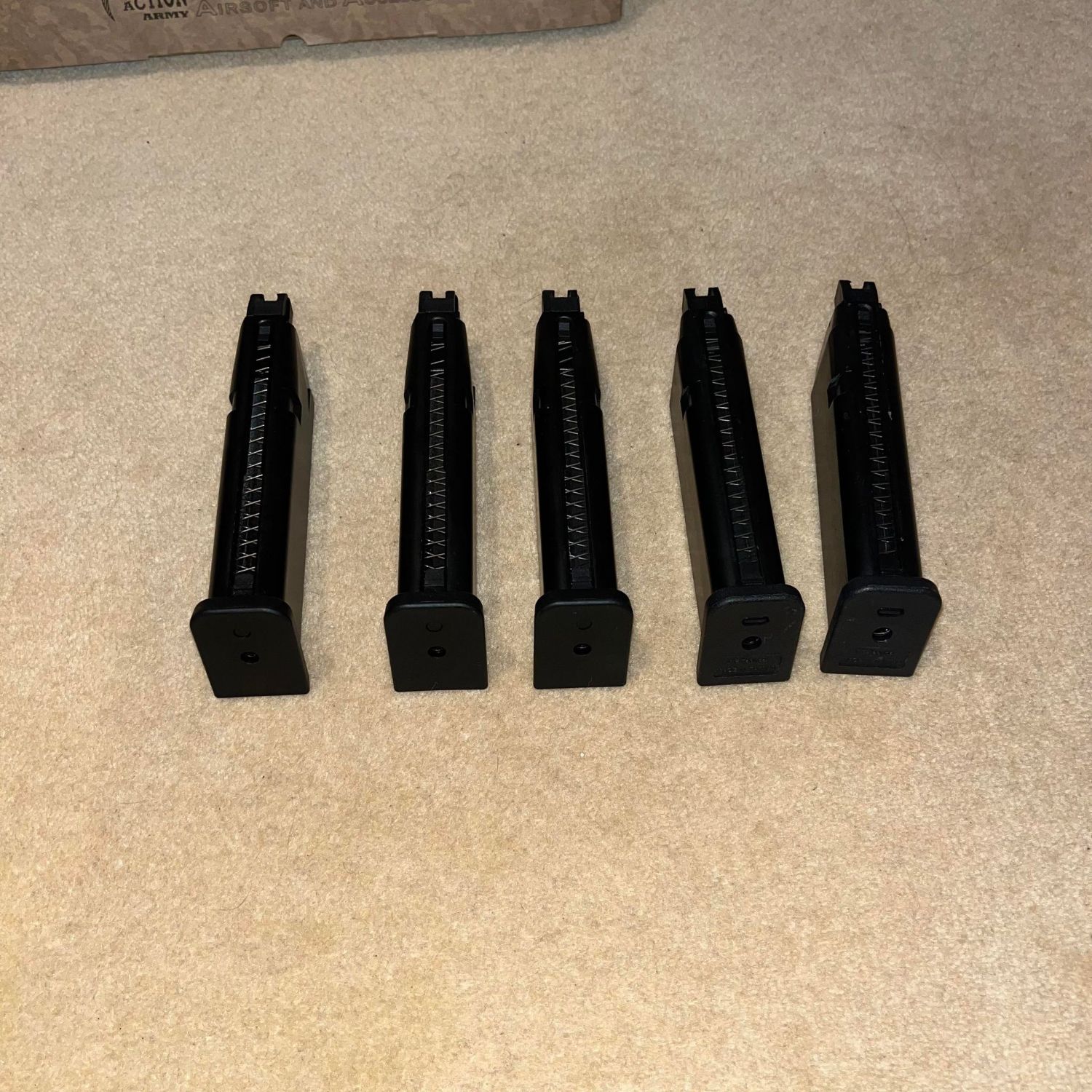 Gun comes with 5 magazines in total, 3 are Action Army and 2 are WE G Series. One of the Action Army mags has a very slow leak on the bottom, this can be fixed with a new o-ring.