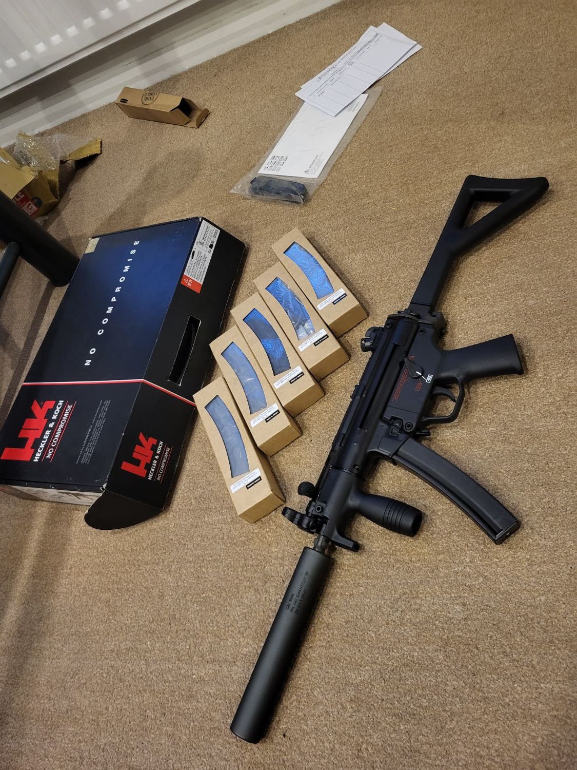 Umarex Mp5k PDW for sale, im lead to believe its an Asia only release so had to be imported from Taiwan. Was imported end of March this year and has had minimal use. Comes with 6 leak free mags some of which are brand new, task force power up/mock suppressor, tight bore barrel which is new not fitted and also comes with the sling butt plate to make it a regular mp5k. This is a ver 2 so steel internals and steel cocking handle so you can practice safe slaps ?. Any questions pop me a message. Willing to drive an hour for a face to face sale or can post.