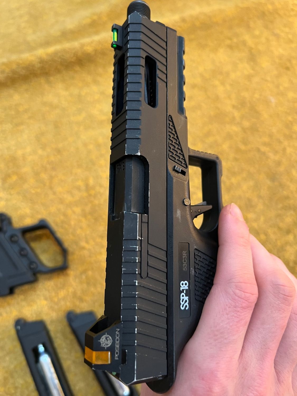 For sale. Novritsch SSP18 with 4 co2 mags (one is missing a baseplate but I can certainly find a replacement in my box of spares) front grip which has 2 rails and also holds a spare mag. The pistol is stock except from the Poseidon Cyclops fibre optic sights. Full working condition. Really reliable sidearm