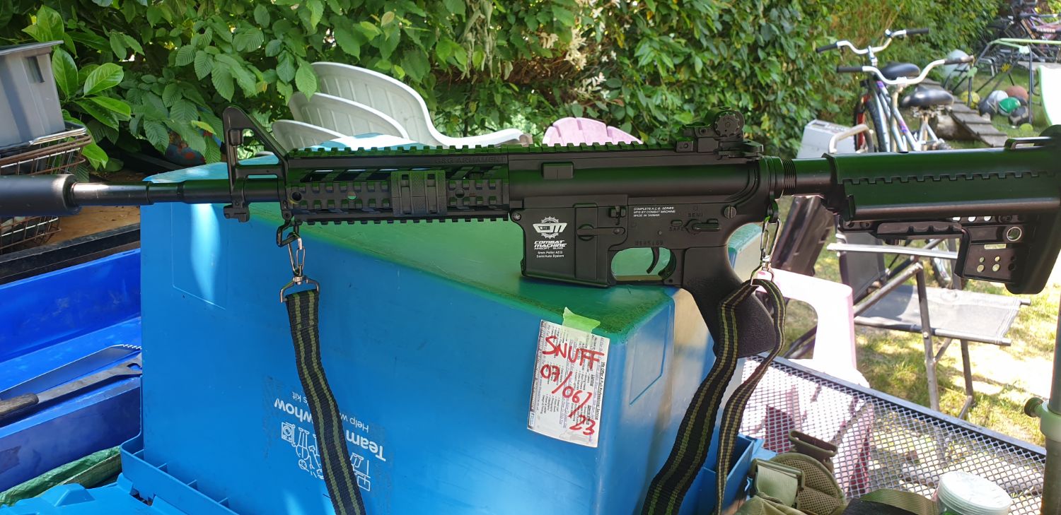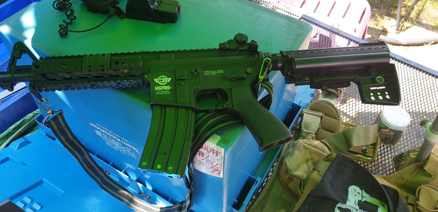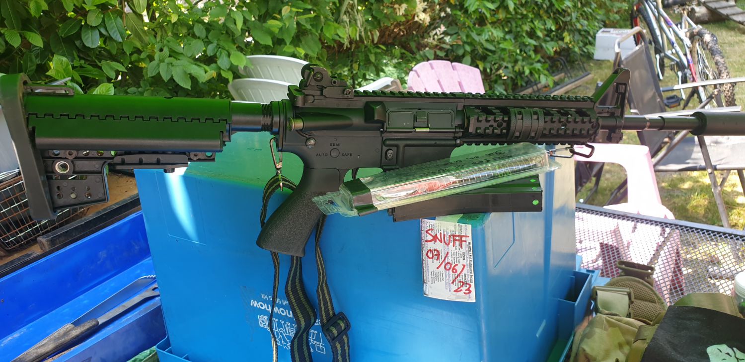 GG Raider in ABS. Another one that I got in a bulk buy and have tested it .Tested and it works exactly as it should,shooting at 300 fps. It has a moderator fitted, upgraded spring, a tightbore and an upgraded hop rubber. It has a couple of rail covers fitted ,metal sights and a strap. Pix are greenish because I took them under a fishing umbrella.Comes with 1 mag and some spare springs.