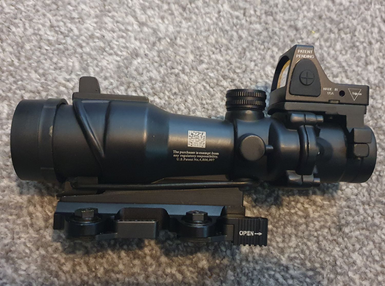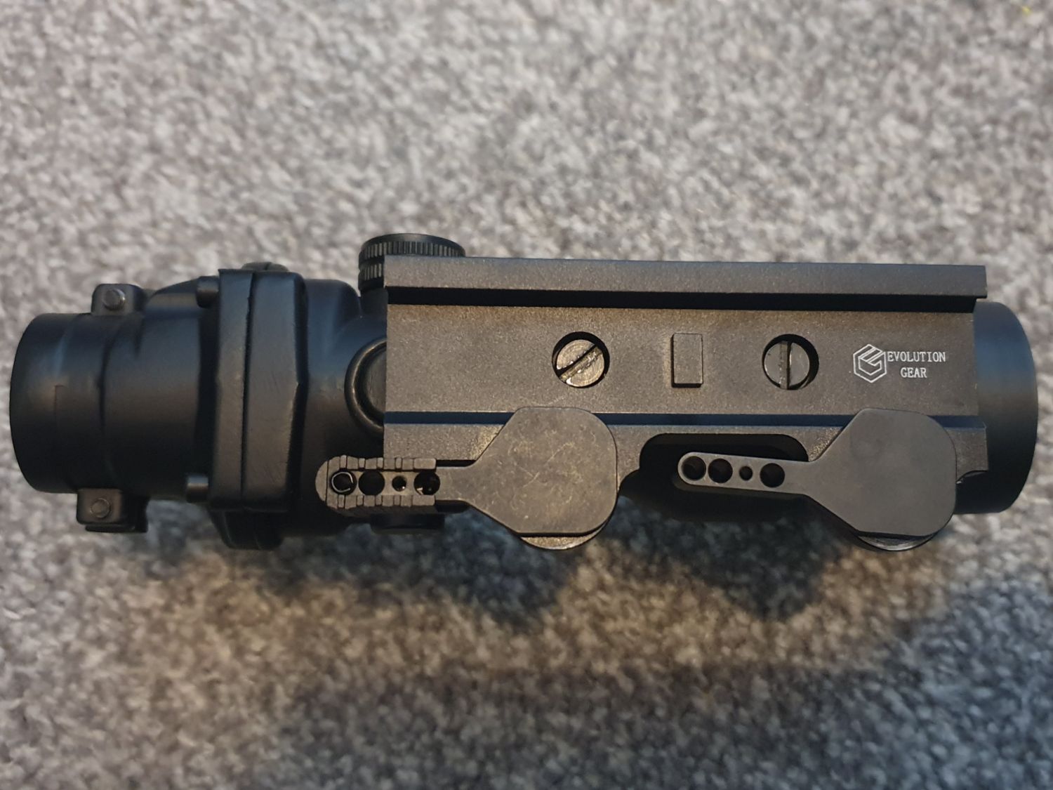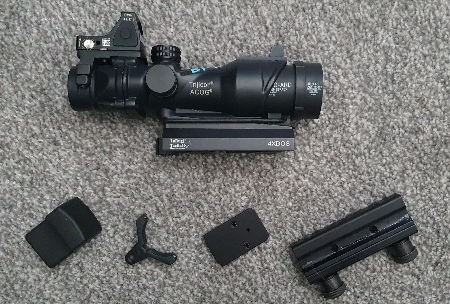 ACOG is the 4x zoom version, full metal made and comes fitted with a Sotac RMR, Evolution Gear Larue LT-100 mount, and a killflash.
