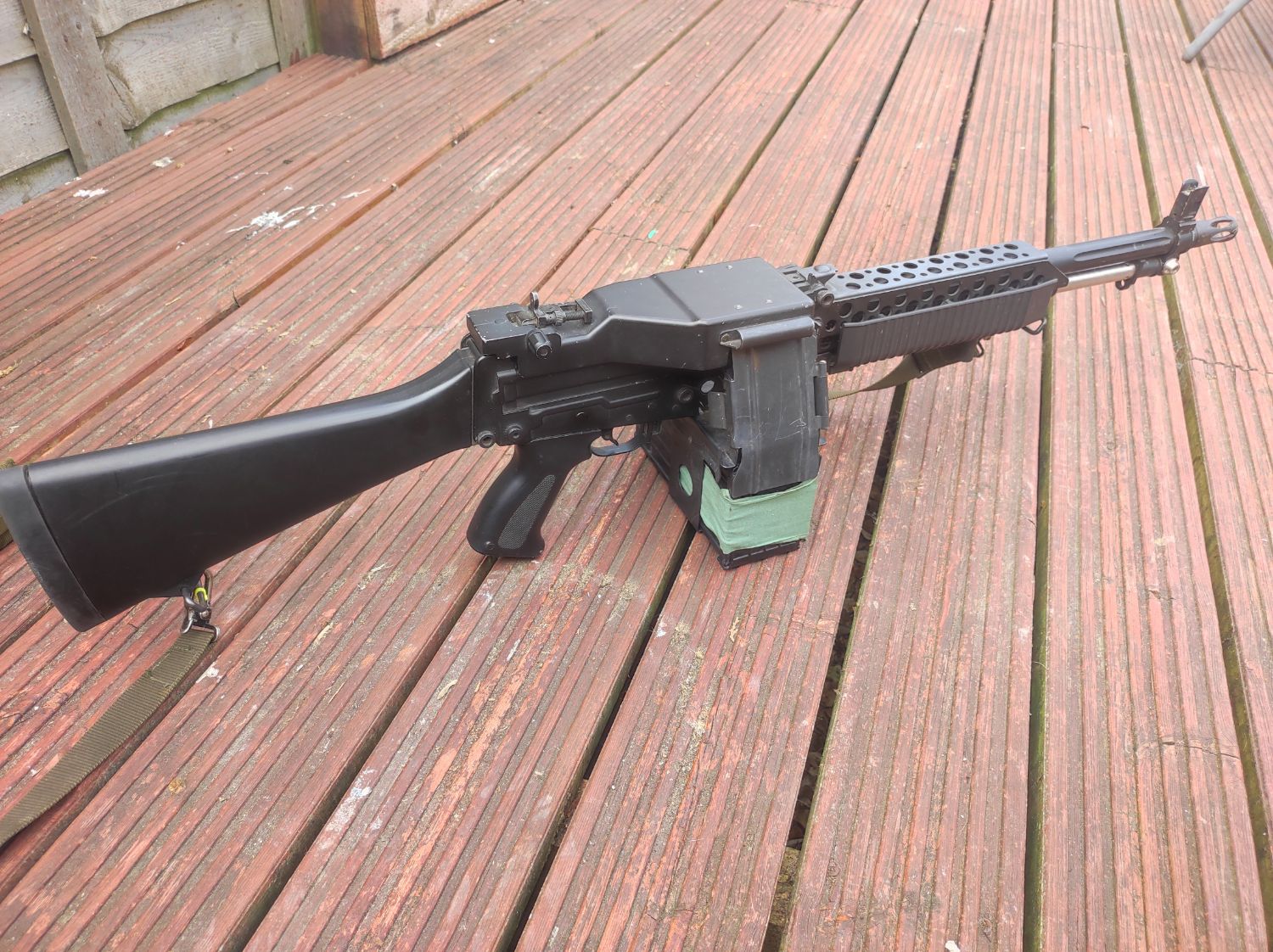 Good condition, a light weathering from use. Comes with 2 box mags, tight bore barrel, hop up rubber and wired to deans. Shoots amazing. I have video of firing if required. Postage extra or collection