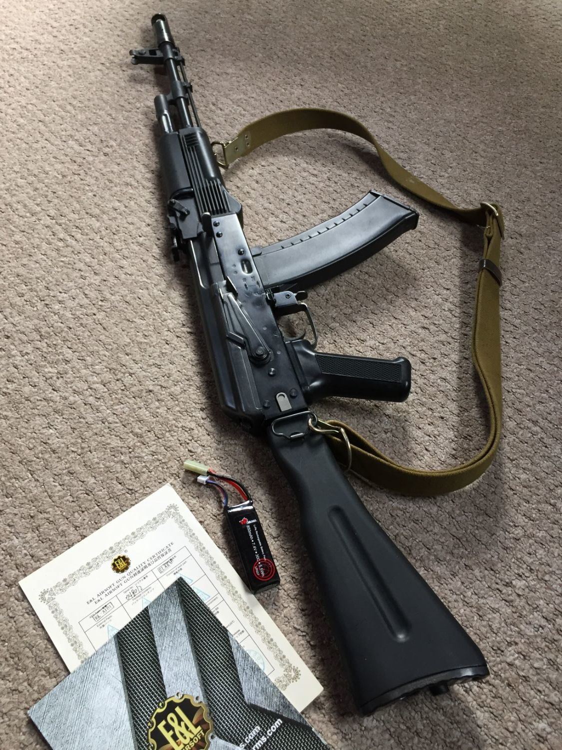 Nice E&L AK-74 (black) with new heavy-duty carry case. New 120 capacity mid-cap mag, new Russian surplus sling. Got it for outstanding qualities as a replica (can’t get much better than E&L - full steel, made in AK factory etc). I'm a collector not an airsofter - so have never fired it! It's clearly been very little used. If for any reason performance is less than it should be, can offer full refund. (Bought it from reputable seller less than year ago - he offered same deal). I've very lightly aged the rifle for extra realism, but no knocks, scratches or dings. Battery and owners manual included. Selling reluctantly, live on boat, space issues! Payment by PAYPAL ONLY. £195 + paypal fees + £20 courier. Or can collect (Nr Ipswich, Suffolk). NOTE: guessing about 3 yrs old, have no info about precise model, from manual looks like 74MN. [Mark64 on Airsoft Hub, I've 100% approval and solid reviews - rifle advertised there too]