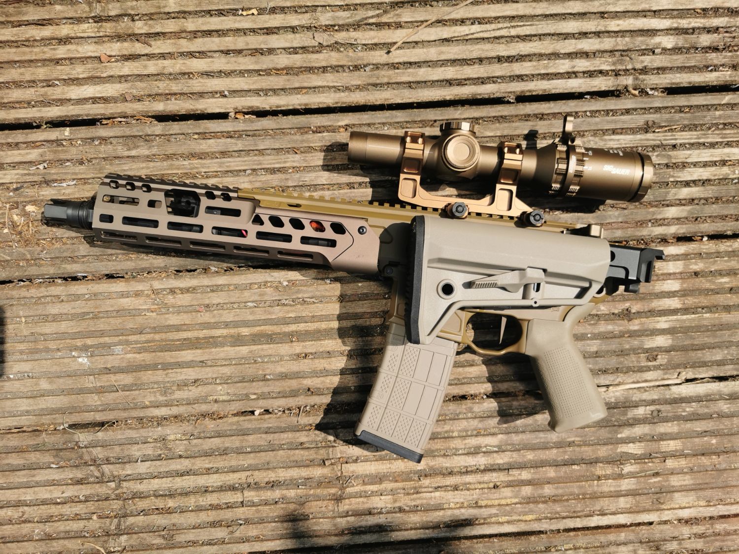 Barely used, just 1 game. Comes with the original rail in tan and original box. Will also throw in 4 Kublai advanced mid caps 2 tan and 2 black.