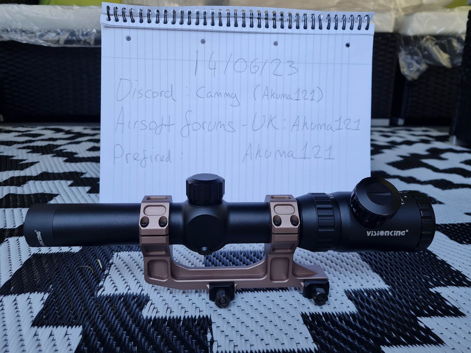 As the title says it's a vision king 1.25-5x LPVO with a replica Geissele scope mount, this particular scope mount model is a proper burnt bronze colour and is raised slightly higher than traditional Geissele style scope mounts so you don't have to lean into your stock to get a proper view down the scope.