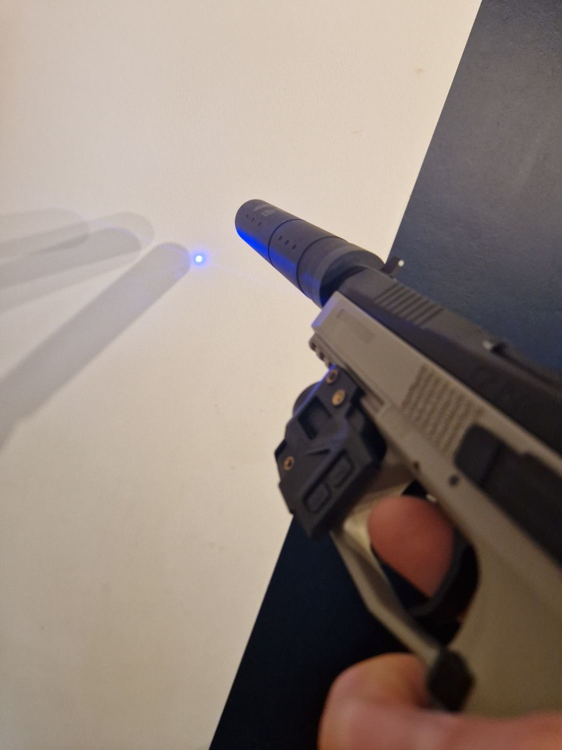 Comes with torch/blue dot attachment. Torch can strobe and the unit is charged with the provided cable.