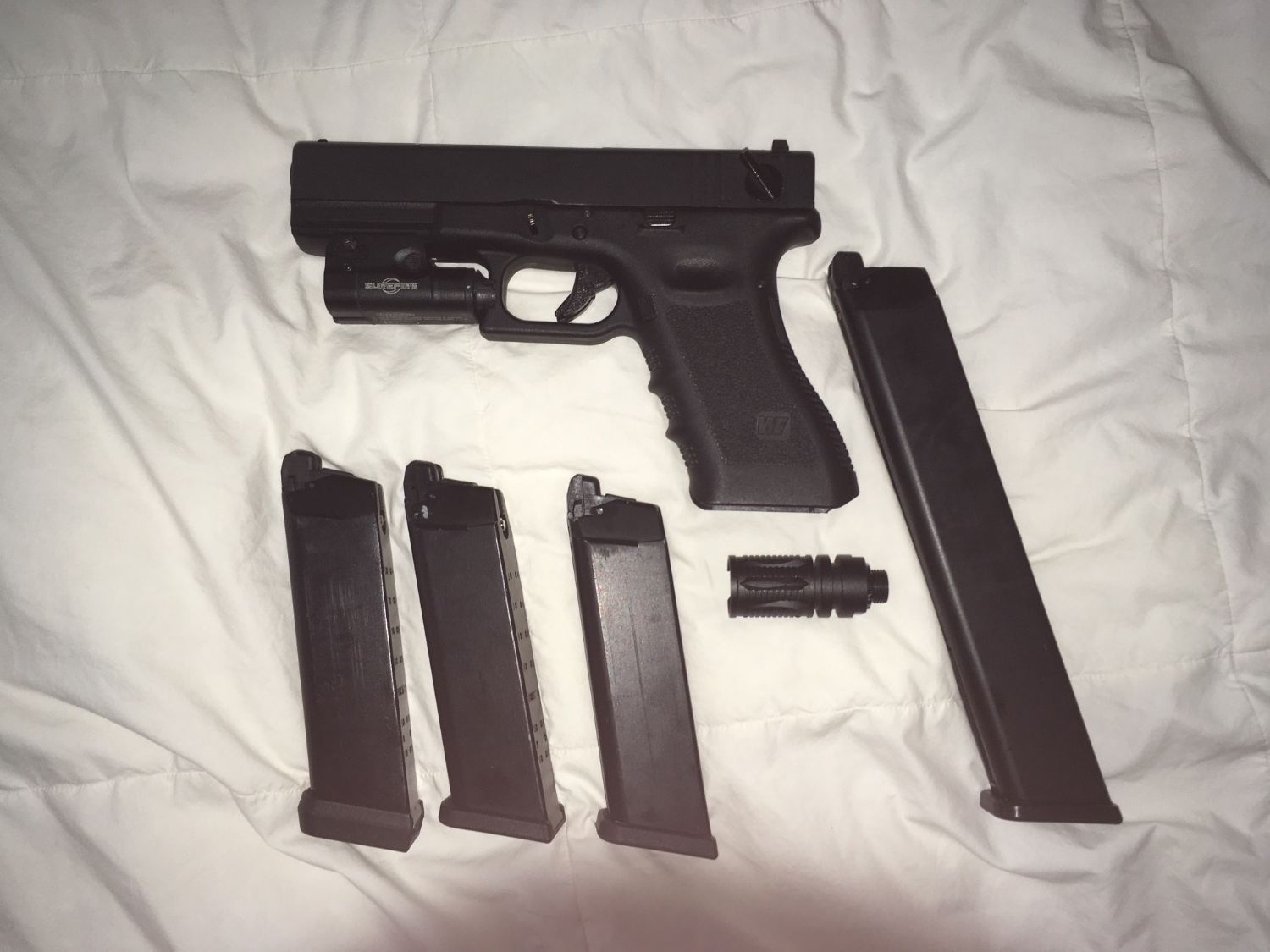 We glock 18 for sale, 3 standard mags and 1 extended, surefire xc2 torch/laser. Any questions please let me know at 07568996891