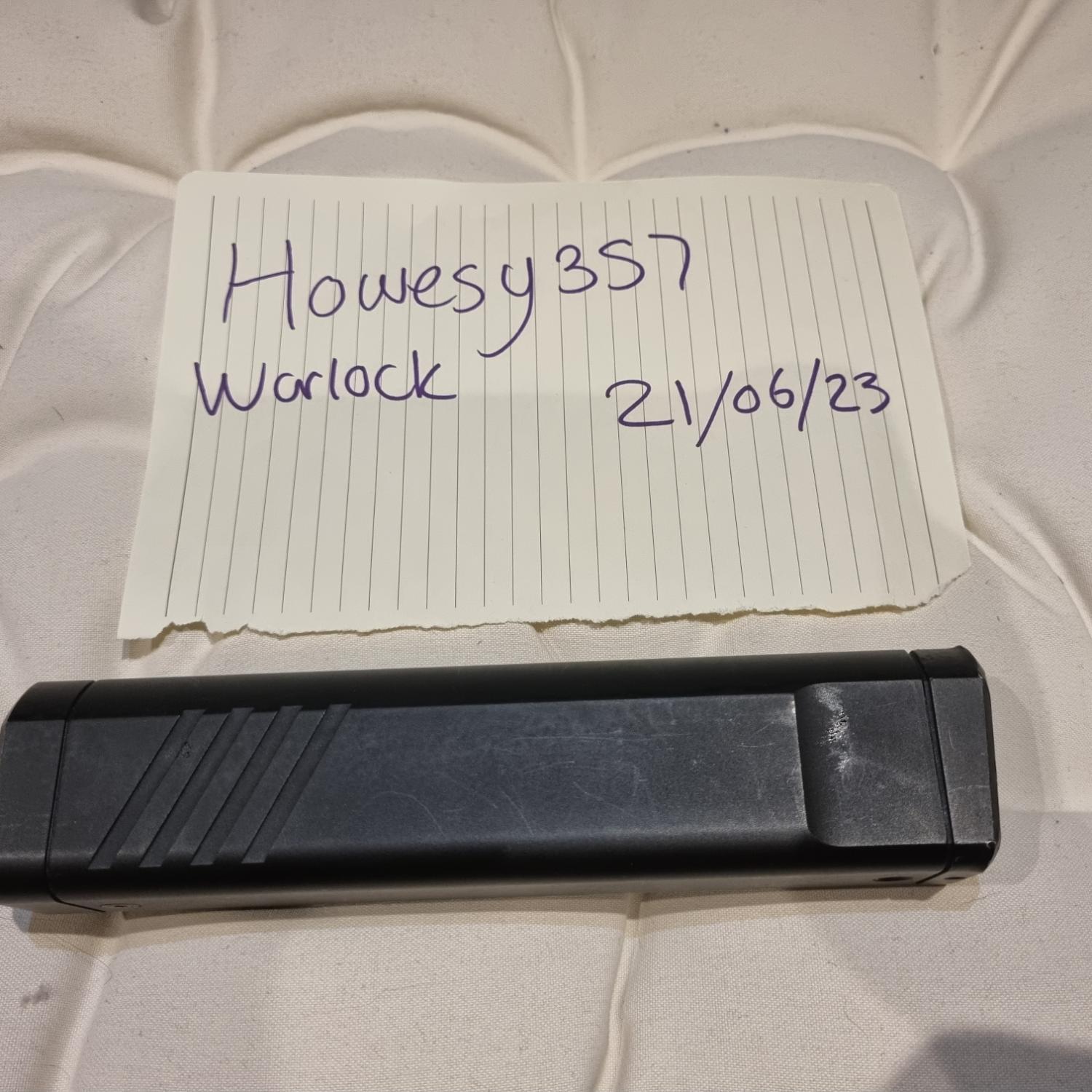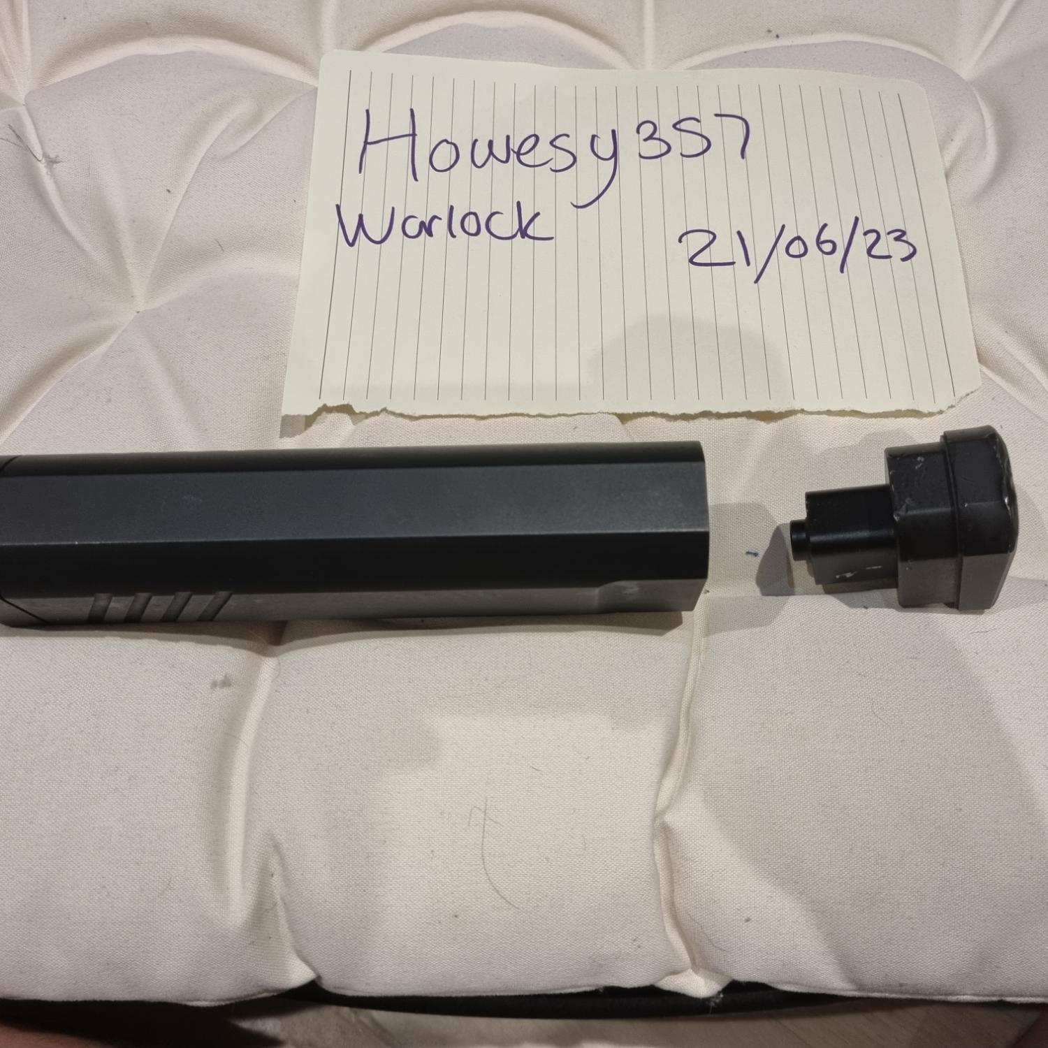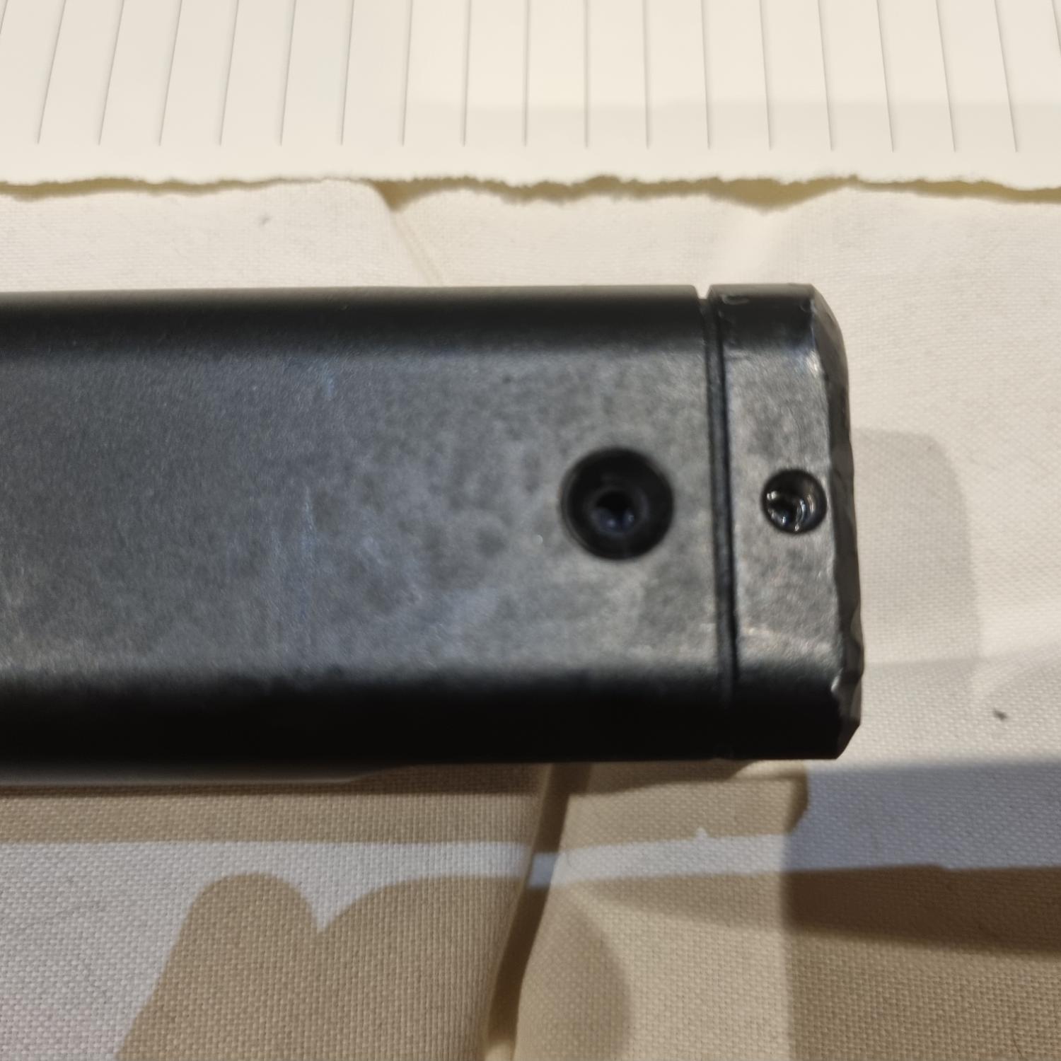 Has seen use and sadly, as can be seen lost a screw that attaches both parts together, this does have a silver barrel running through the suppressor