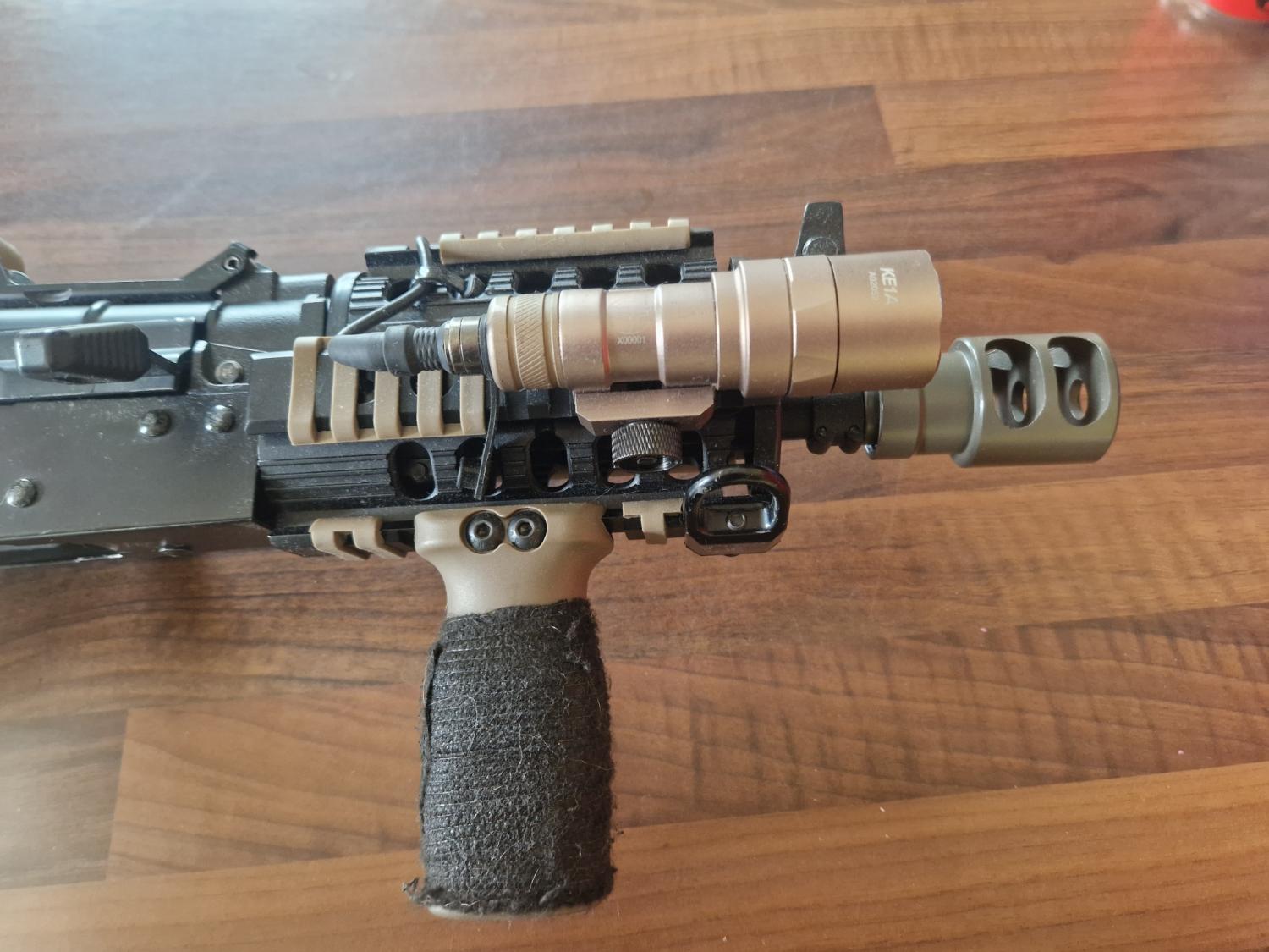 Holographic sight, torch, railed hand guard, railed top cover, cyma 416 style grip, more style fore grip, m4 buffer tube and tactical ak stock, muzzle brake, 4 mid cap mags, electric drum mag.