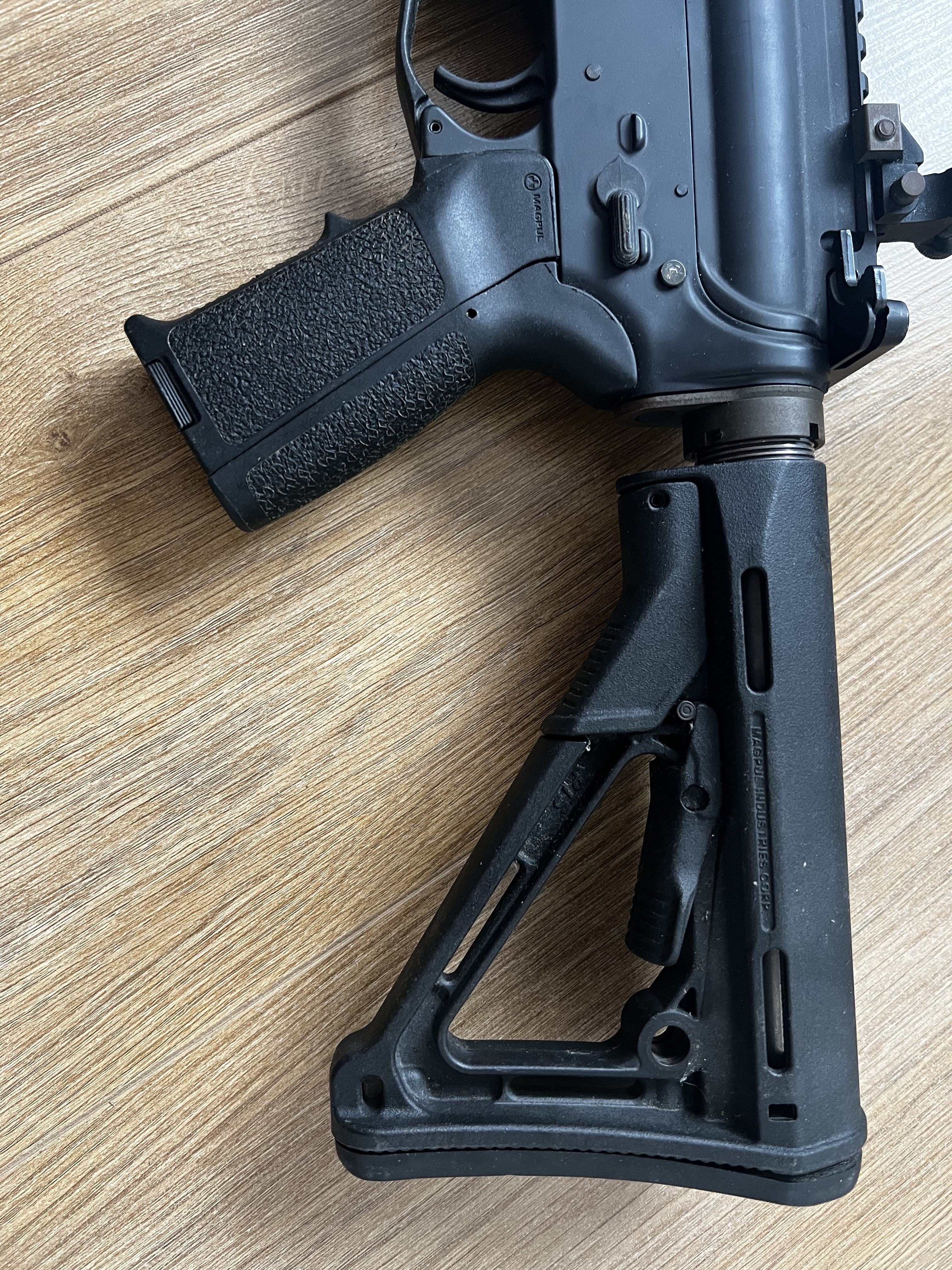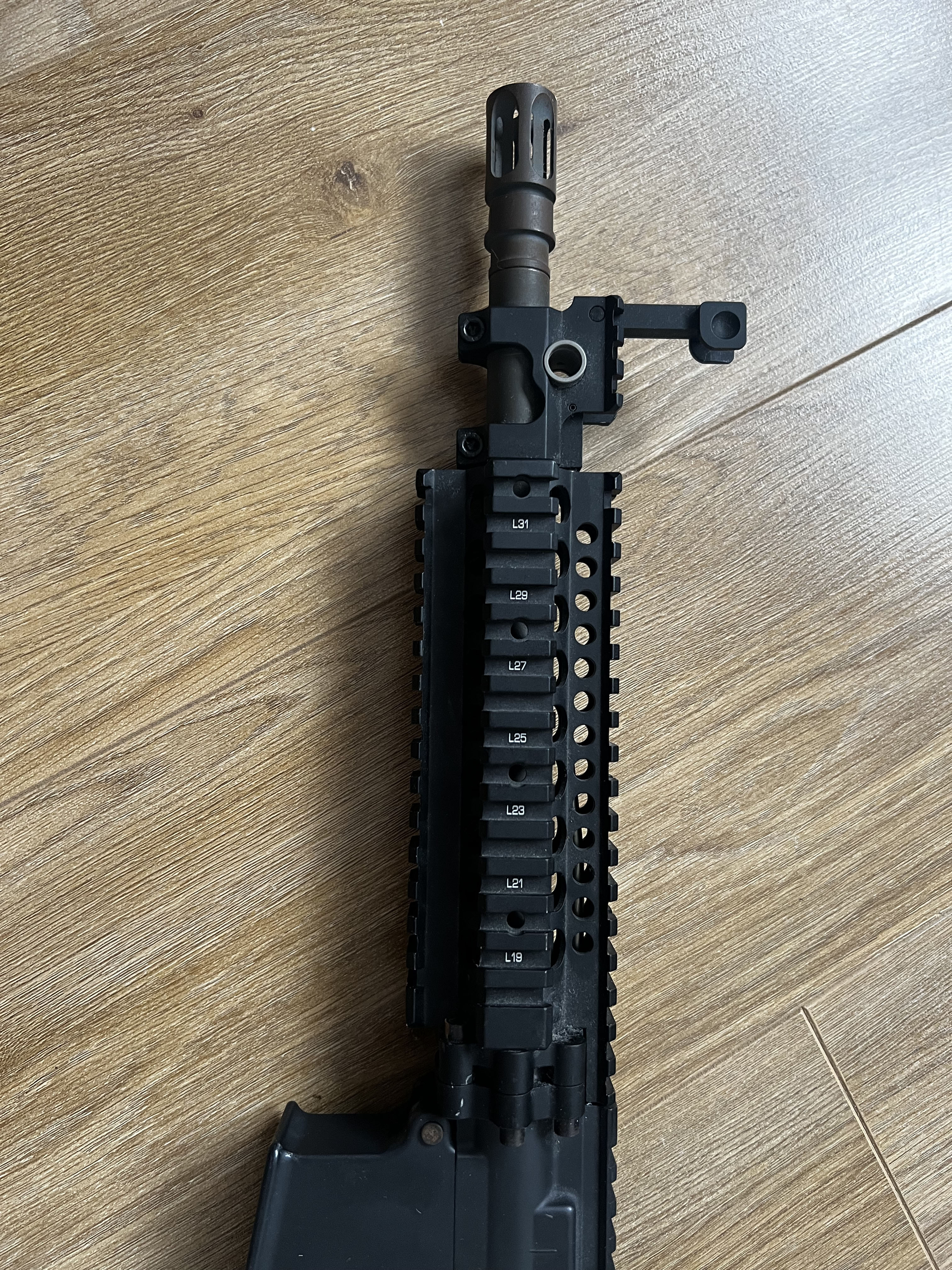 Systema PTW 08 MAX (from what i can remember), magpul MiAD grip and trigger guard, mapul stock, RIS forgrip and flip up front and rear sights. I bought this originally as a project from some-one who unscrewed the stock tube without clearing the wires, severing them. I had several ptw's at the time and guess never got round to reattaching the battering connector (see photos)