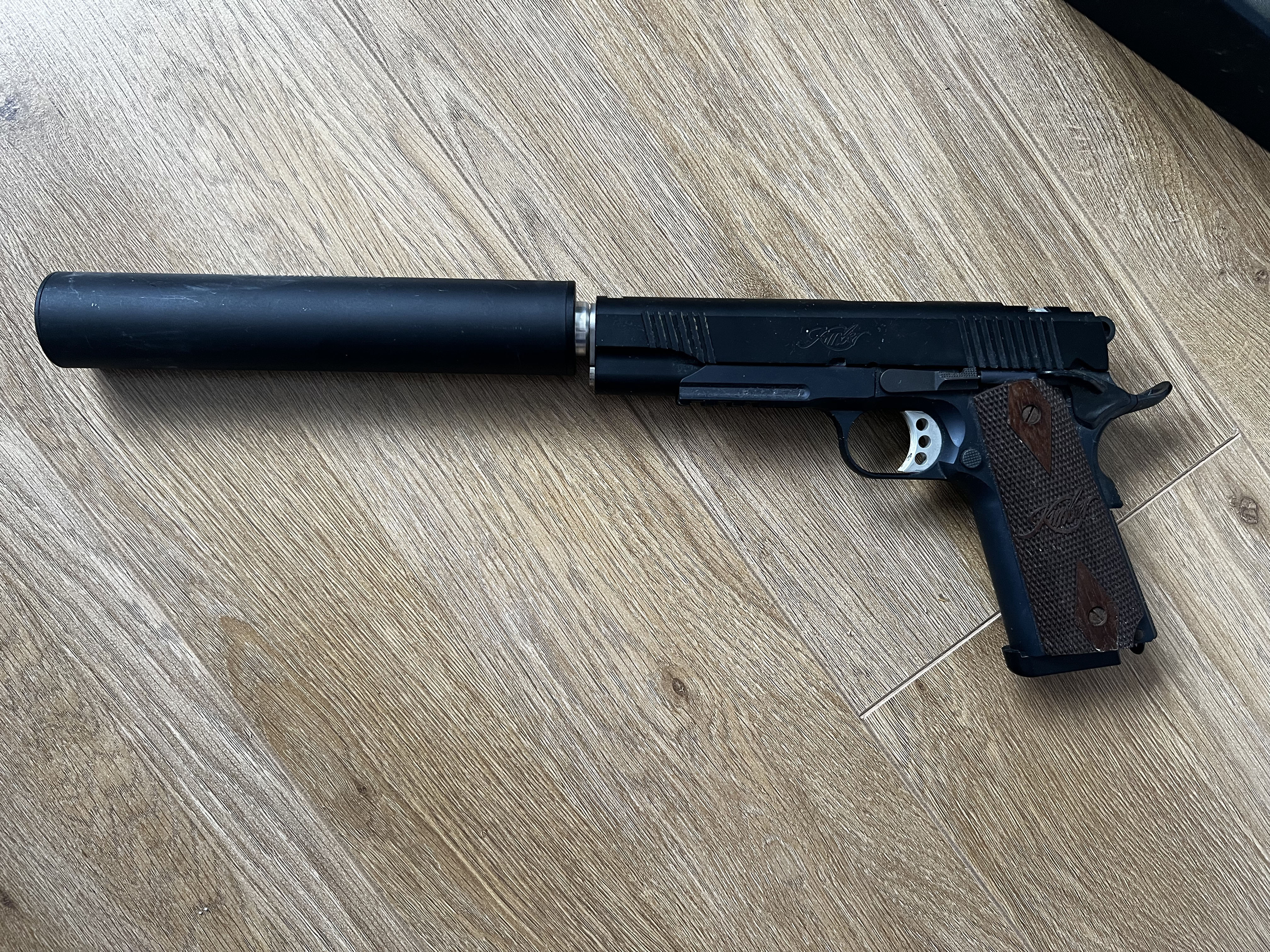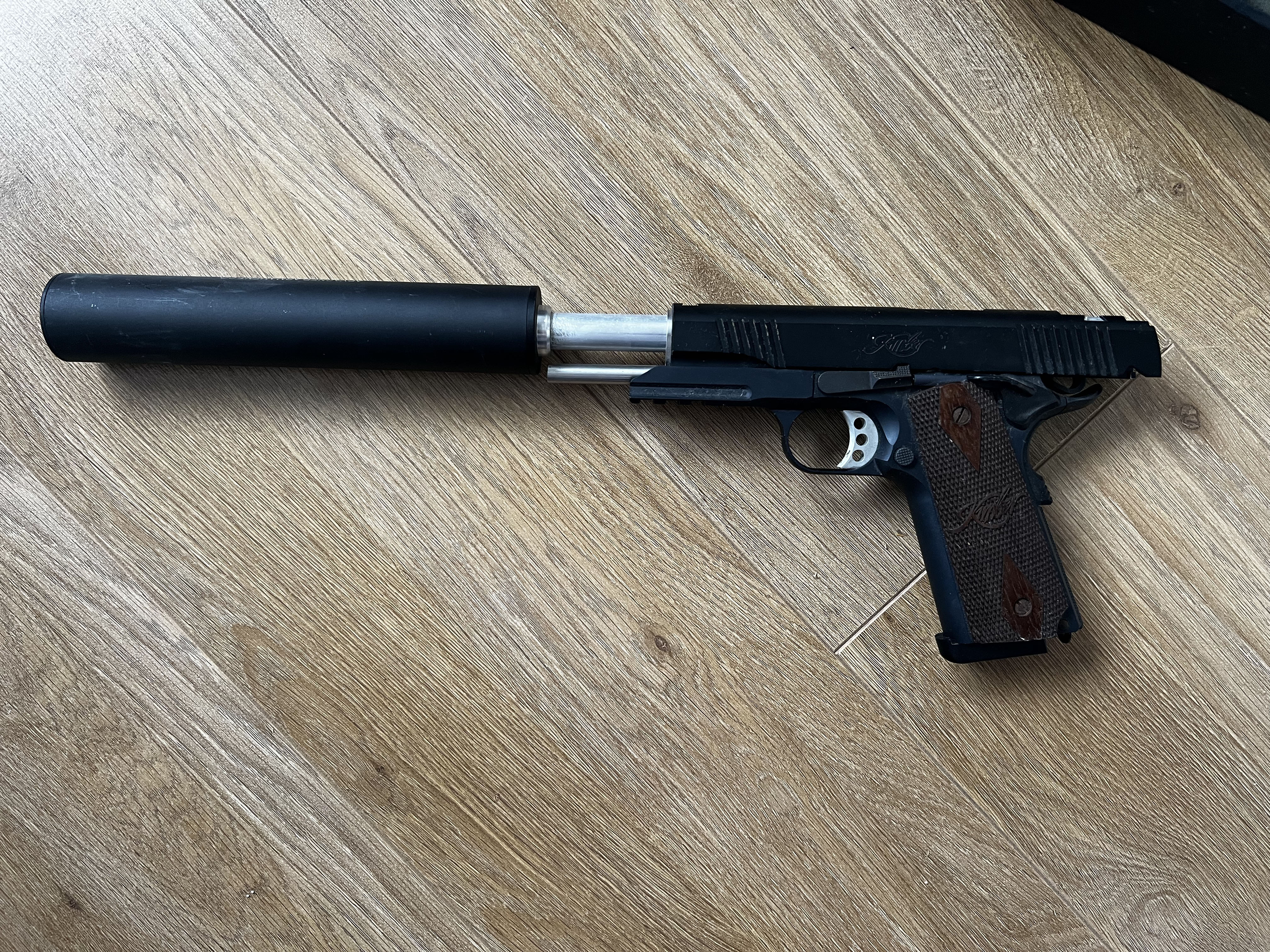 All the internals including GBB housing, nozzle, leaf spring and springs were from Airsoft surgeon, body was a mix of a kimber/nova kit, threaded barrel and extended guide rod, ambi-thumb safety, nova trigger, grip saftey and hammer, pretty much no part remained of the original TM 1911. Comes with suppressor.