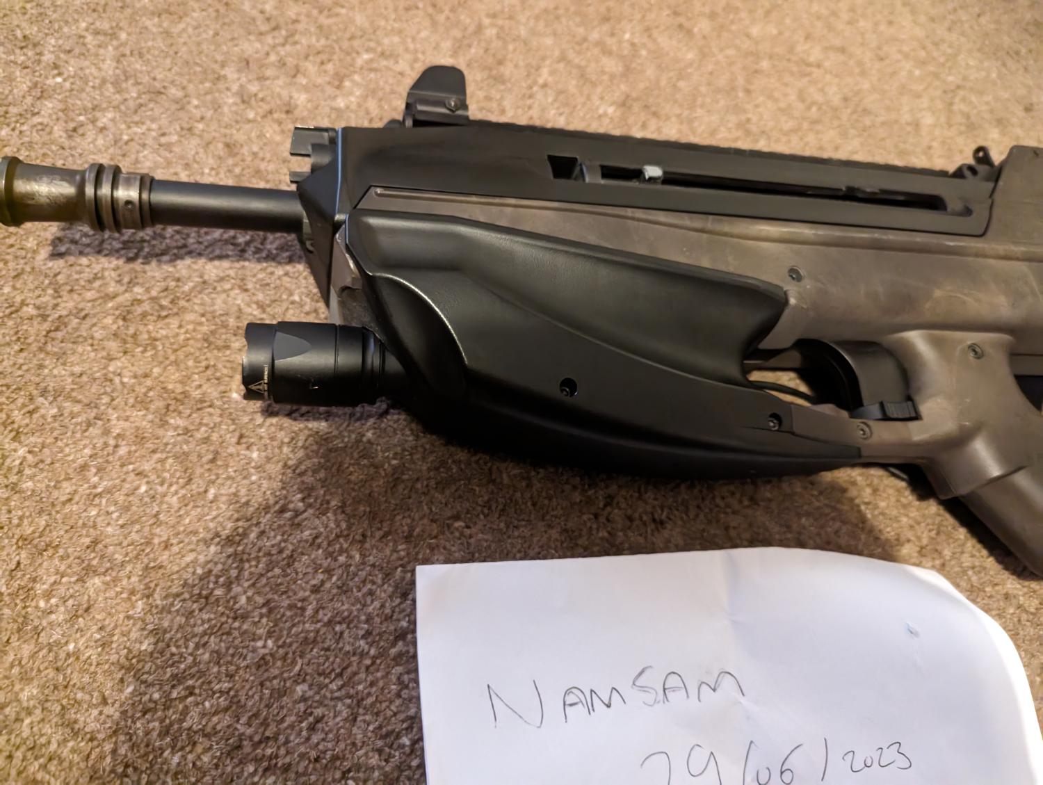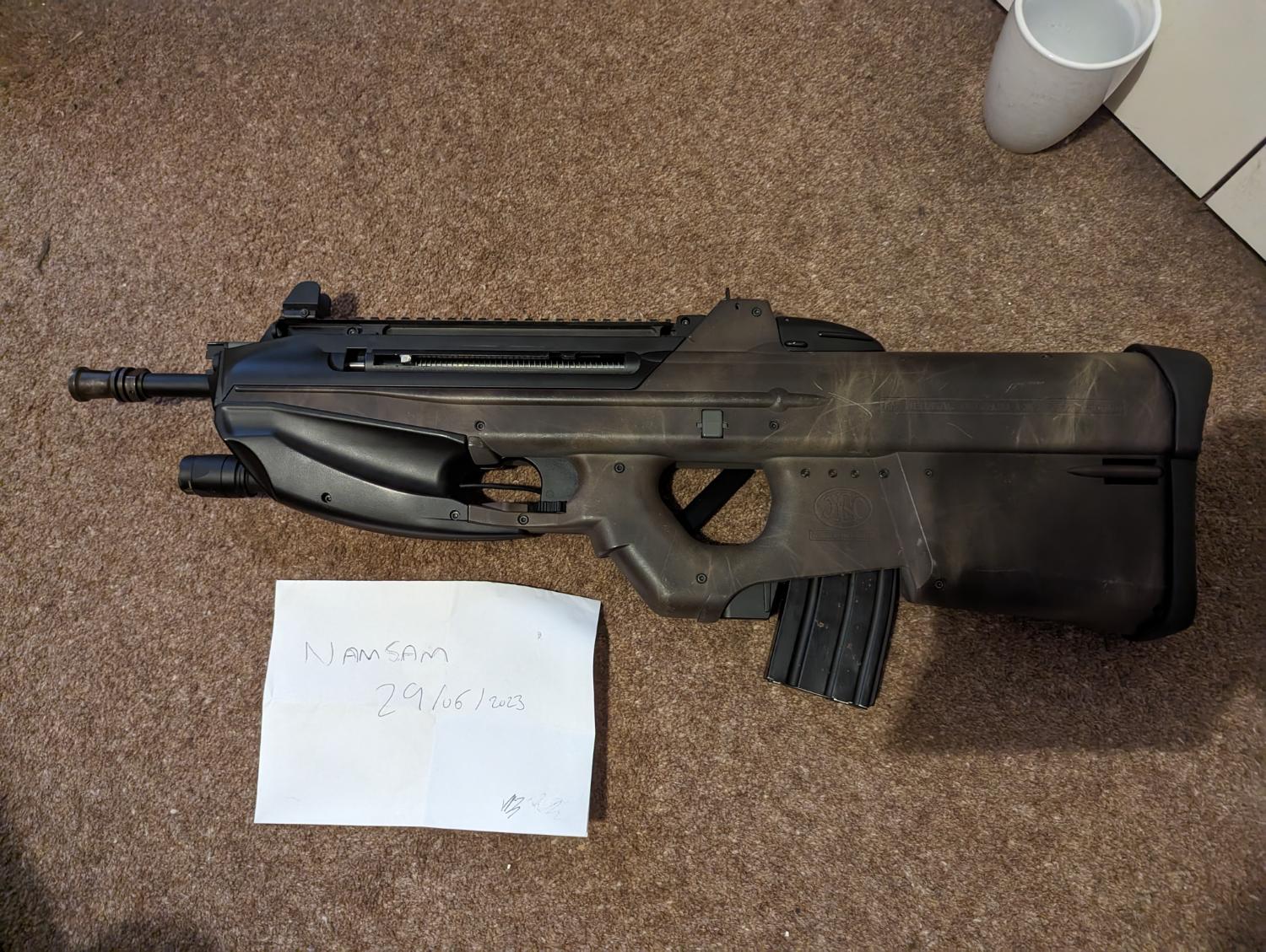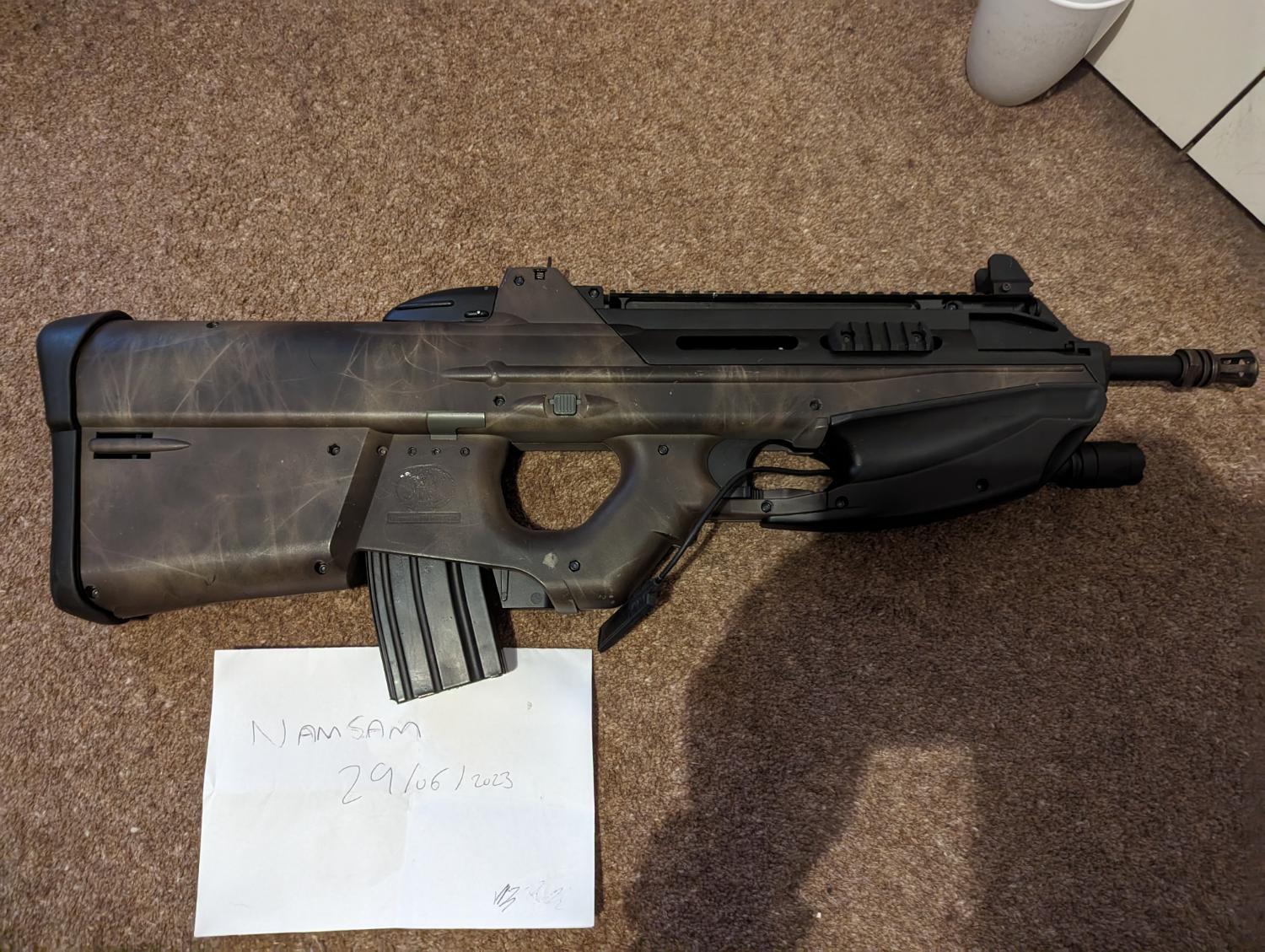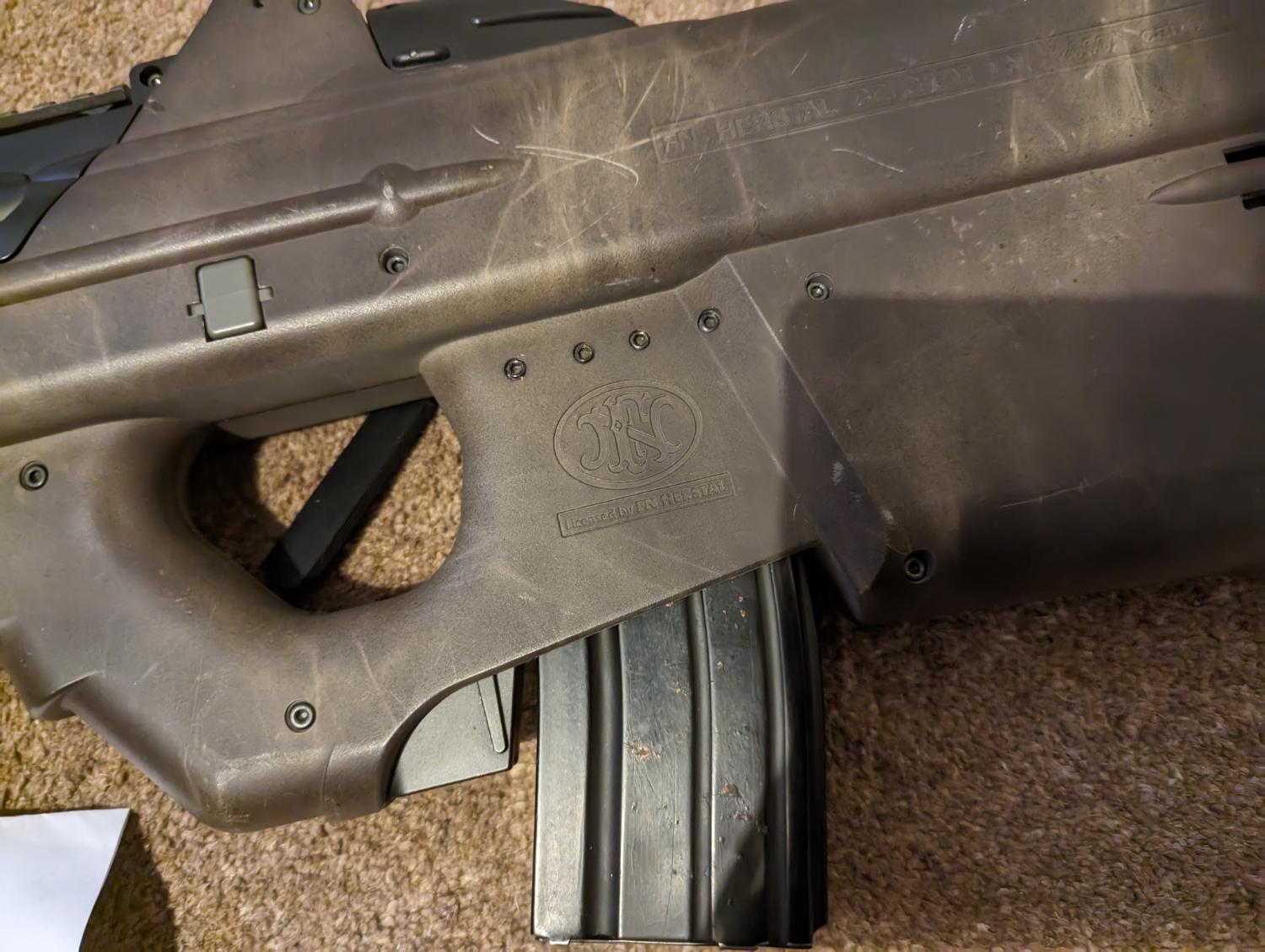 This is my Spare FN2000 (because everyone needs 2?) This is the cybergun version so has a few trades on the body. The previous owner has done a spray job on the RIF as can be seen in the pictures and also they seem to have spent a lot of money on internal parts, the barrel, hop unit, rubber, motor and lots of the internals are all aftermarket!