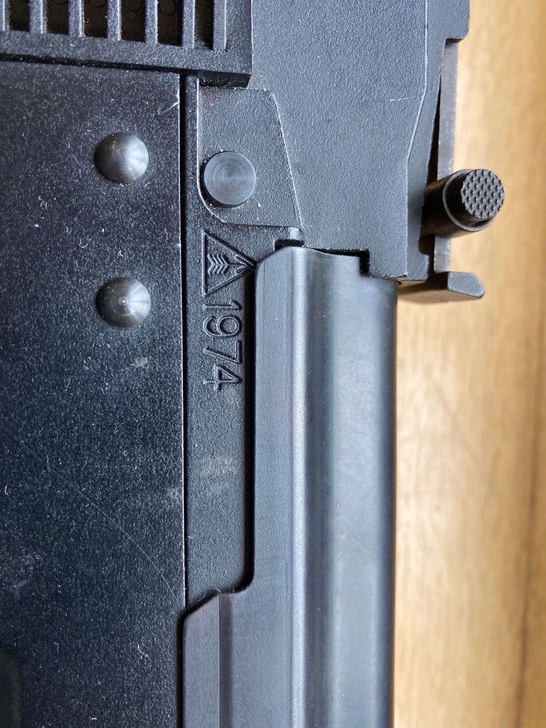 Gun is metal and plastic with a solid stock that takes a large battery.