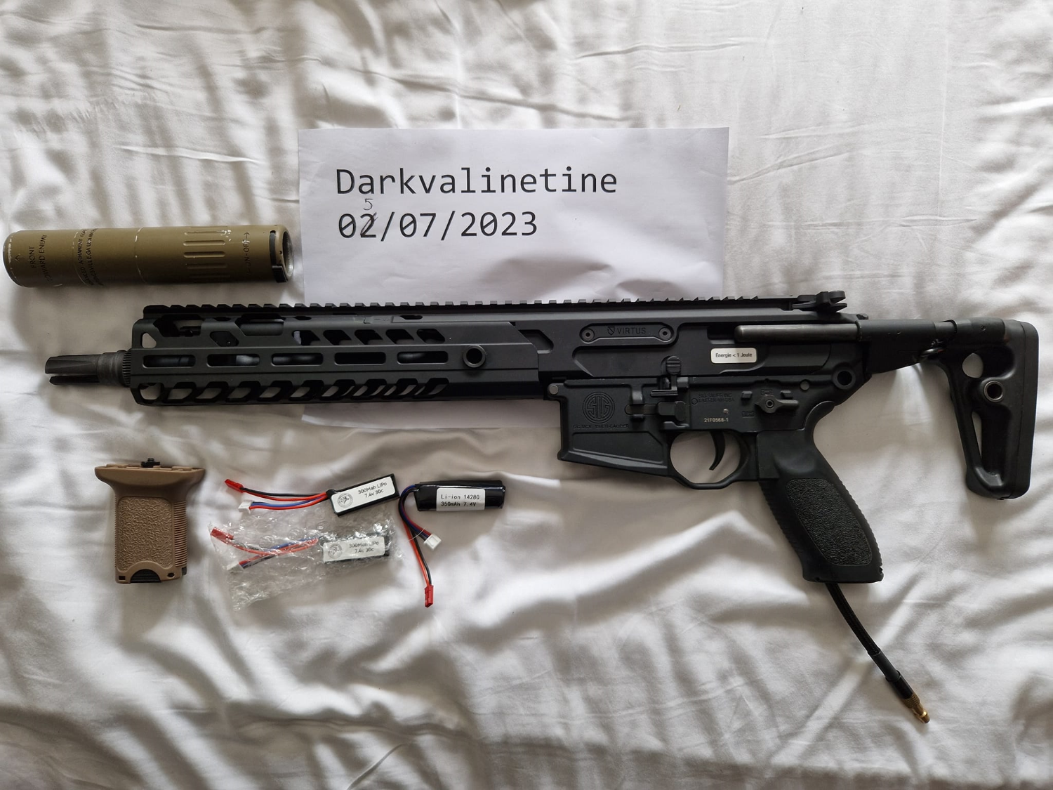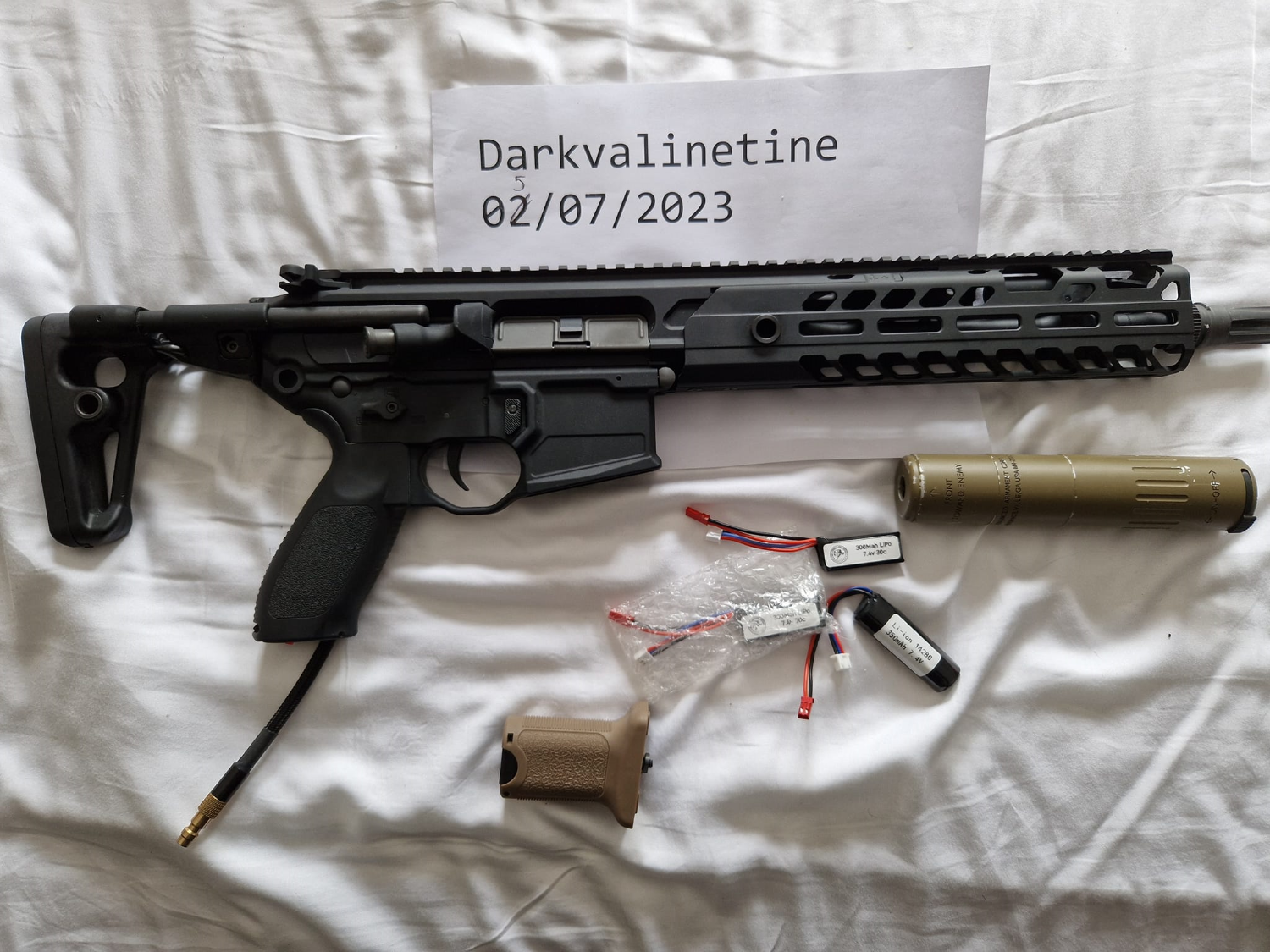 comes with 3 batterys, quick detach suppressor and foregrip