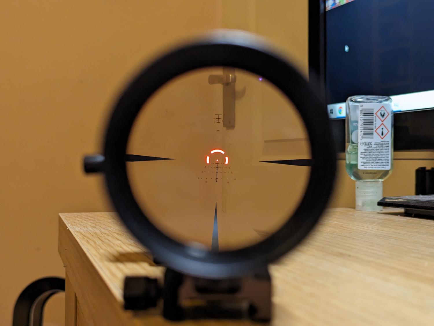 The turrets are capped and tool-free, and have zeroing markers. Reticle is AR-BDC3, second focal plane with illumination from a CR2032 battery which is included. RMR is a single dot from an included CR2032 battery.