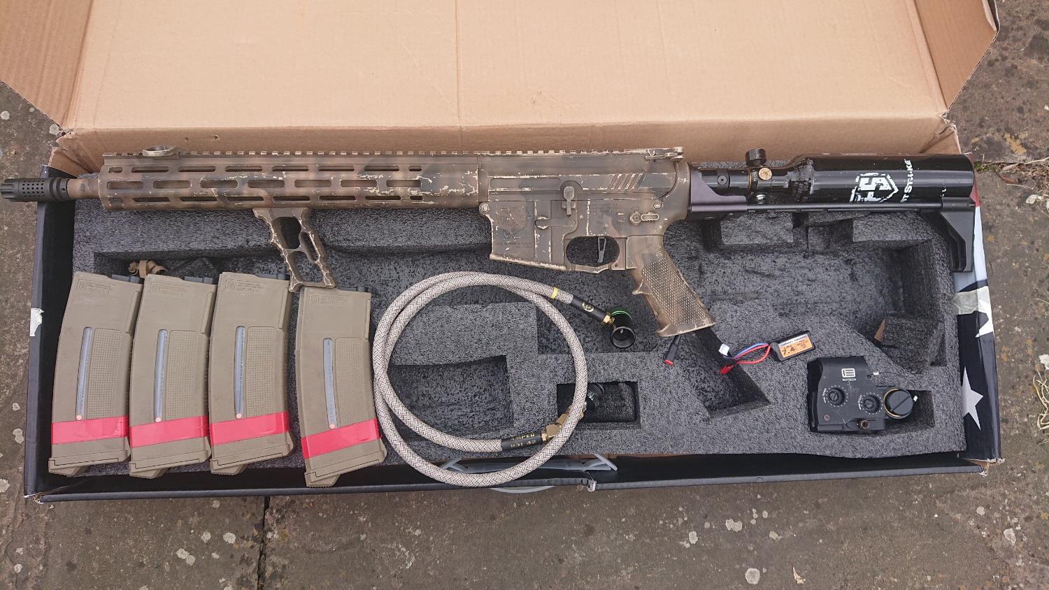 shoots perfectly and aside from the paintjob is in very good condition though it needs a bit of a clean as its been in storage for a long while. The charging handle is missing its spring though it stays locked forwards just fine. The cheek pad from the wraith stock is also missing but this does not affect function. This is the billet aluminum version with the bolt hold function though none of the mags to activate it are included. Fps was 370 when I got it but I have adjusted it down to 340