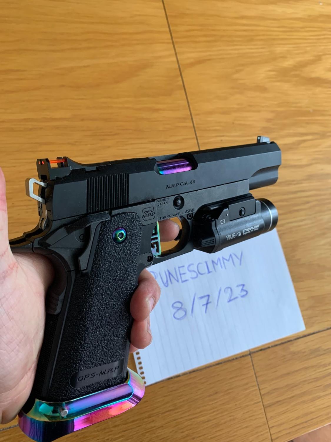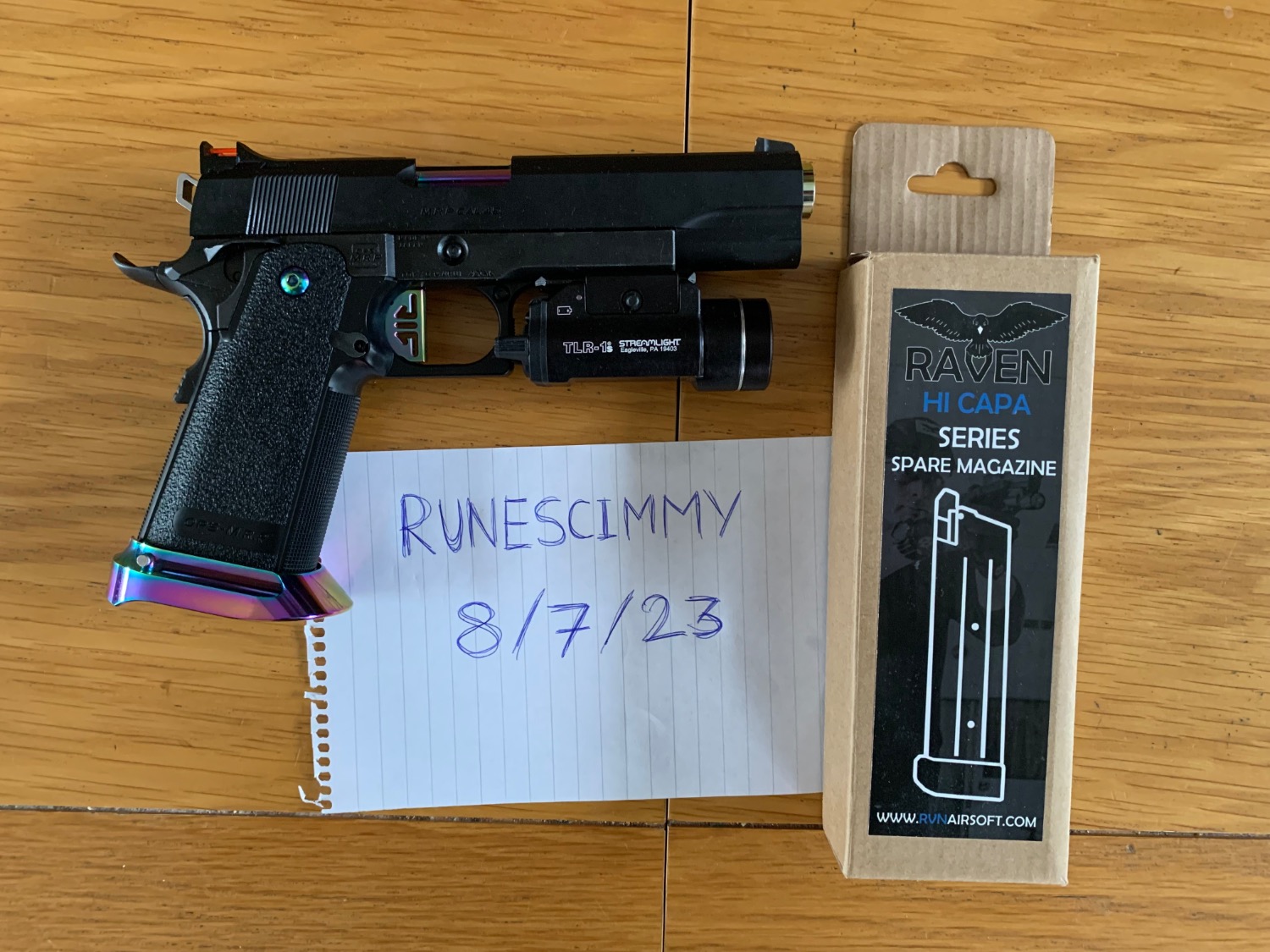 This is a custom Tokyo Marui Hi Capa I’ve built using some left over parts. It comes with a TLR-1S 300 Lumen flashlight and a Raven Hi Capa standard magazine.