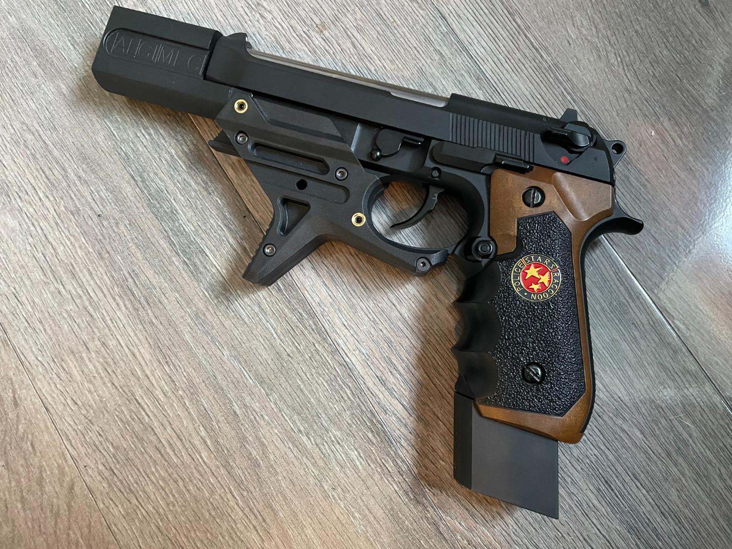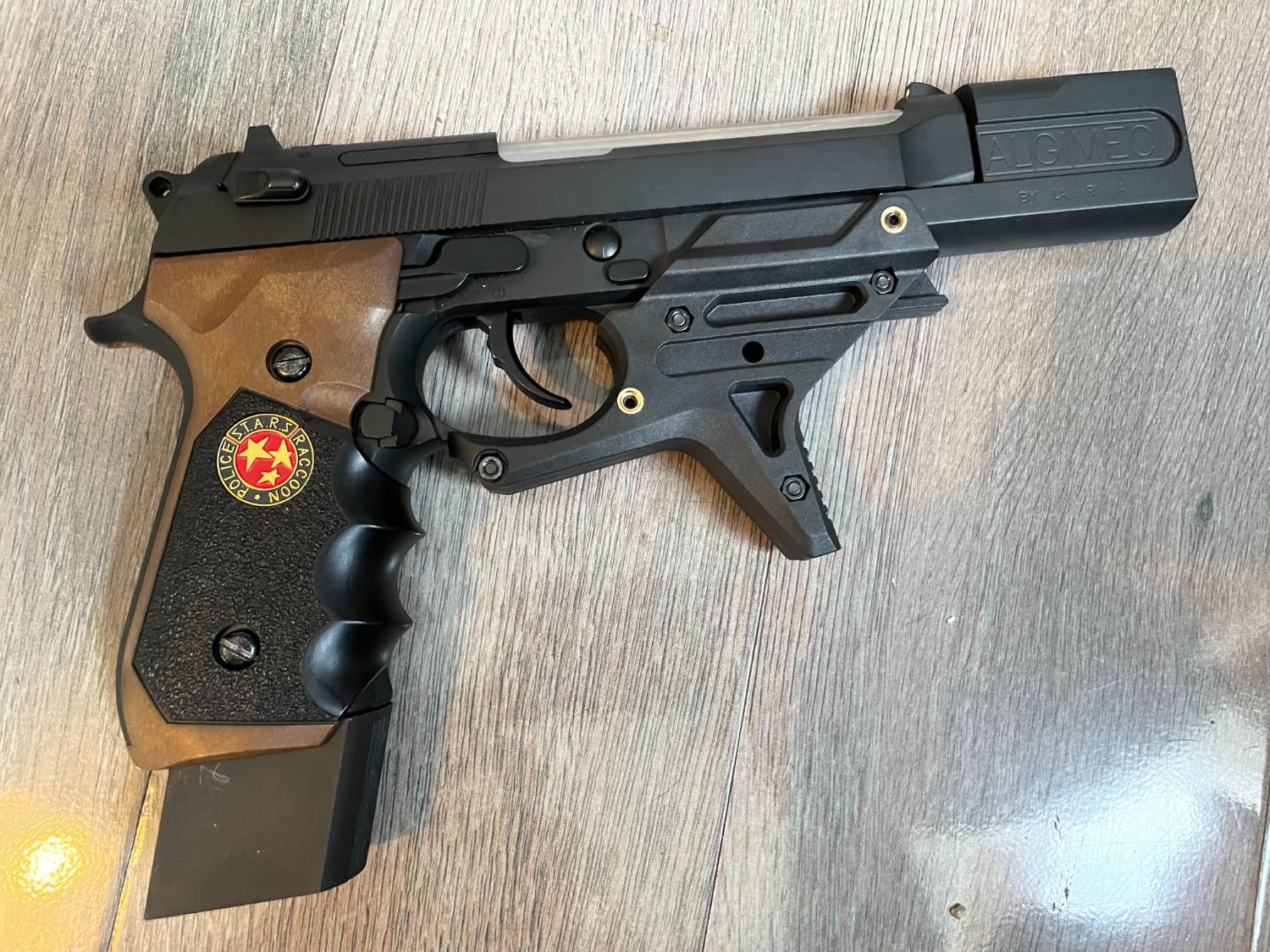 Slide and frame are standard WE M92 parts I believe, and the faux-wood plastic Biohaard grips were an add-on.