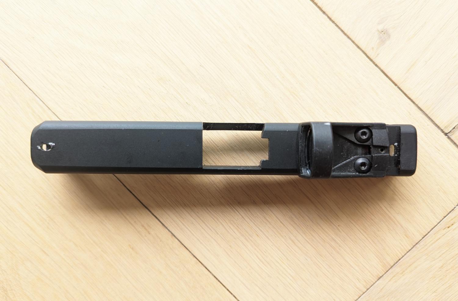 VFC original slide (and outer barrel) which have been tapped for M4 for the Shield SMS footprint, incidentally the screws spacing allow for the installation of Leupold Deltapoint, Eotech EFLX provided you cut the bolts (M4) down to the relevant length and potentially head size depending on the model of the optic, but for Shield SMS (and clones), they will be compatible with M4 button heads. RMRs are totally different footprint fwiw.