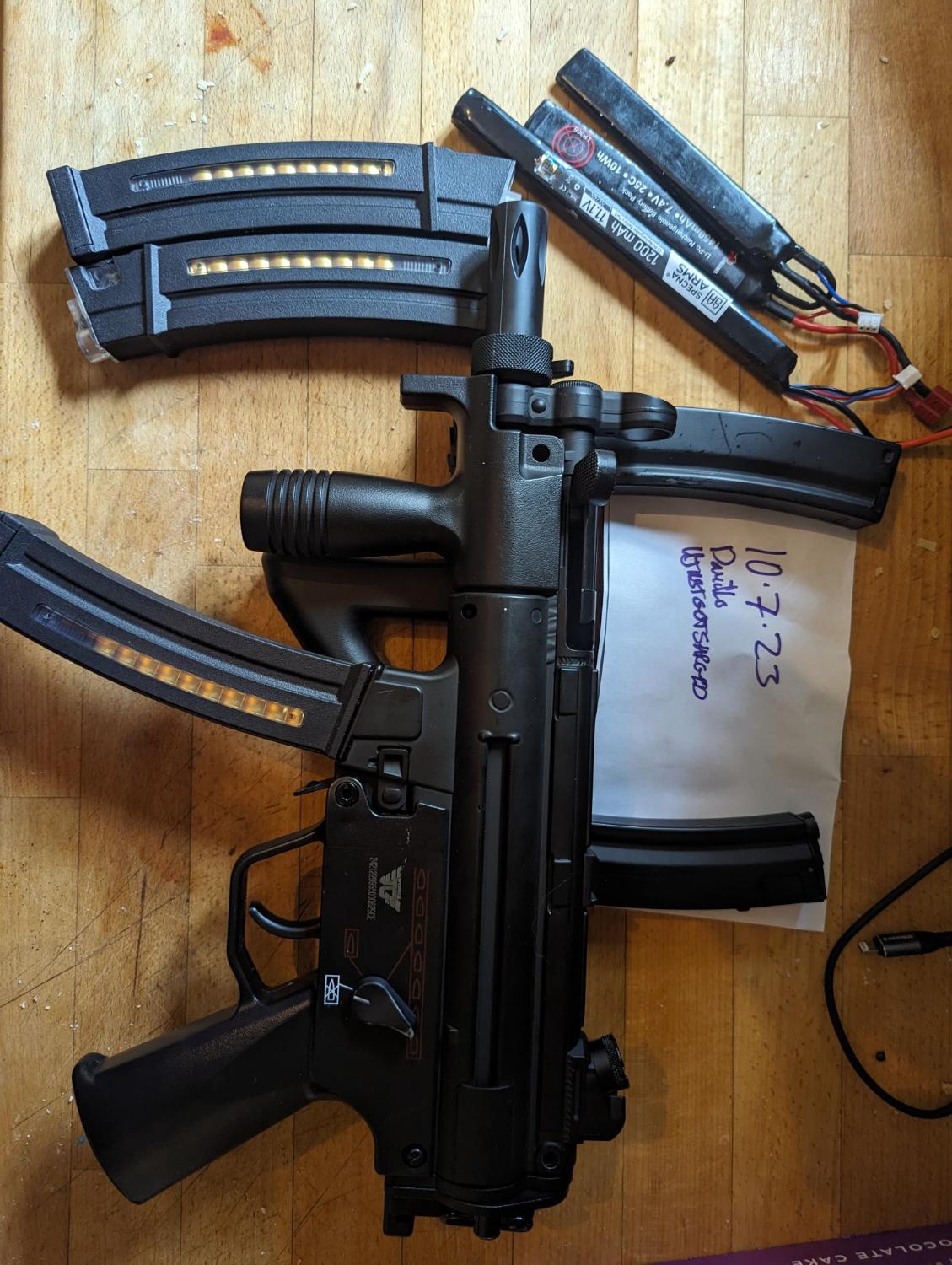 Fully working, fully stock. has 3 cyma pmag midcaps, modded to fit. 1 normal size hi cap and 1 small hicap mag. 1x7.4v lipo, 1x 11.1v lipo. Missing 2 pins (rear top/handguard) however nothing is loose and these are cheap to replace.