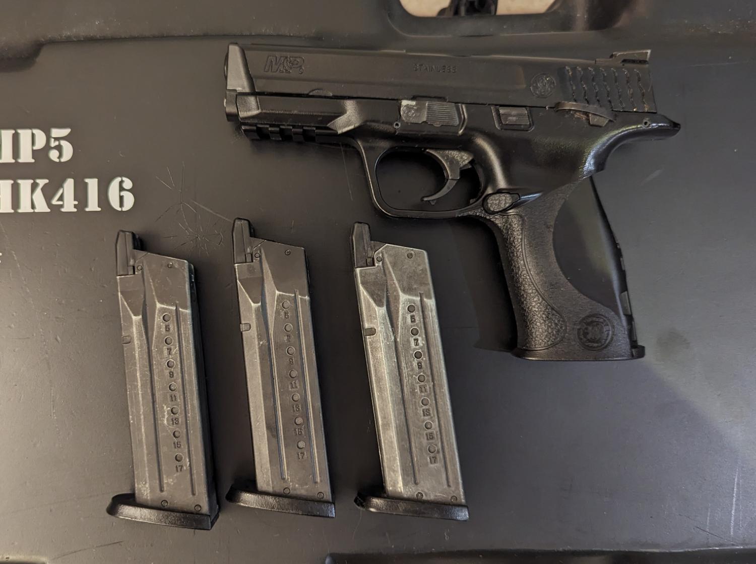 tokyo marui M&P9 missing grip and front sight, shoots fine but all 3 mags leak, probably just o-rings but i got this in a bundle and hate it, price includes parcelforce 48 shipping and paypal fees, and questions or offers please message me on 07592359306. Thanks, Dan