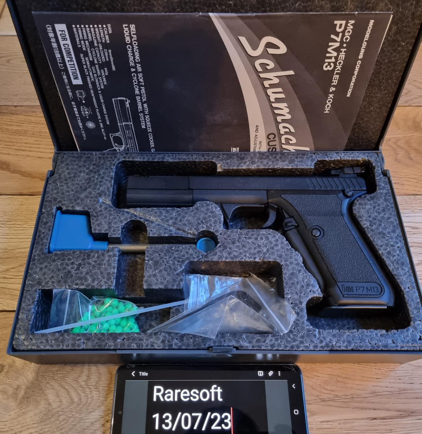 For sale is my MGC P7M13 Schumacher Custom. Boxed and complete as seen, with all accessories (apart from the HK bottle opener...that's staying with me). Works as it should, very rare in the Schumacher Custom format.