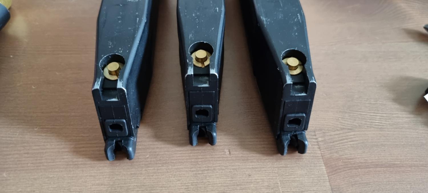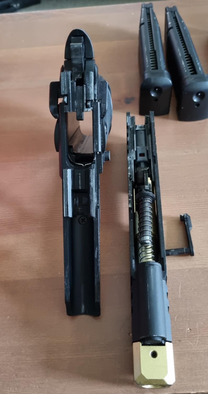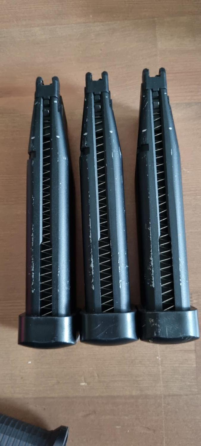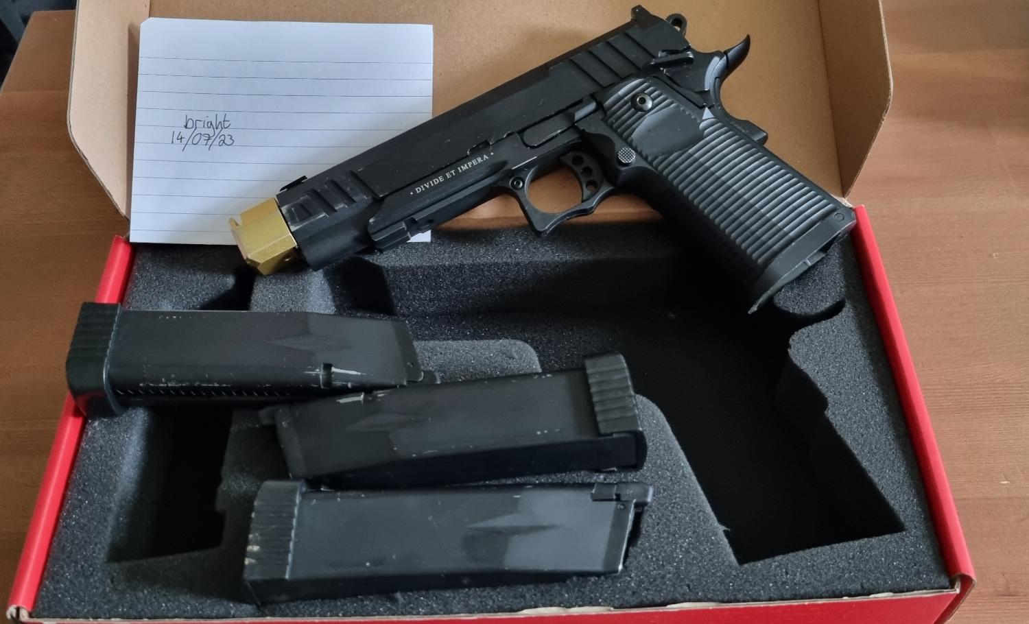 Comes with original box, 3 gas-tight CO2 magazines, low and high power nozzles, and gold compensator fitted. Hard-kicking, accurate, and loud.