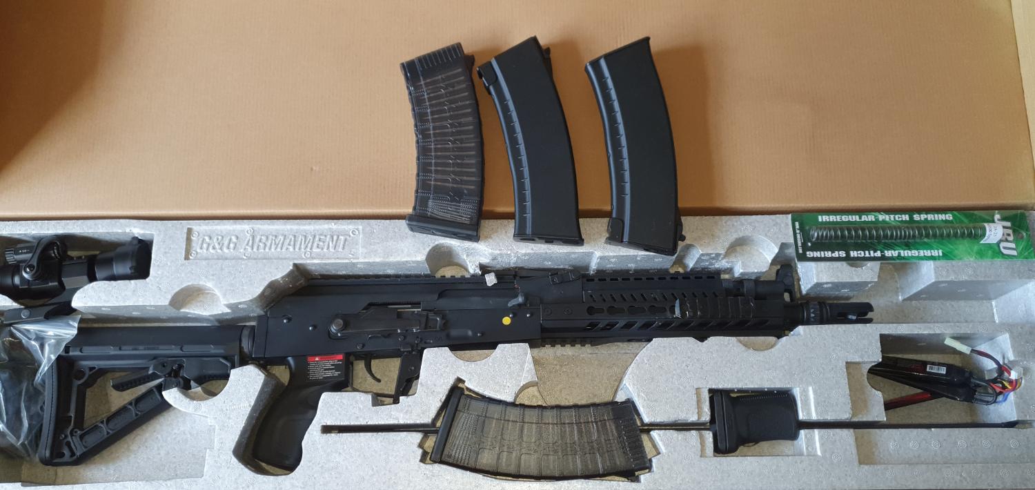 Here for sale is boxed as new, never use in the field a G&G AK47e, has uprated spring, 4 mags scope and front grip. Battery. Great looking bit of kit. Unwanted present.