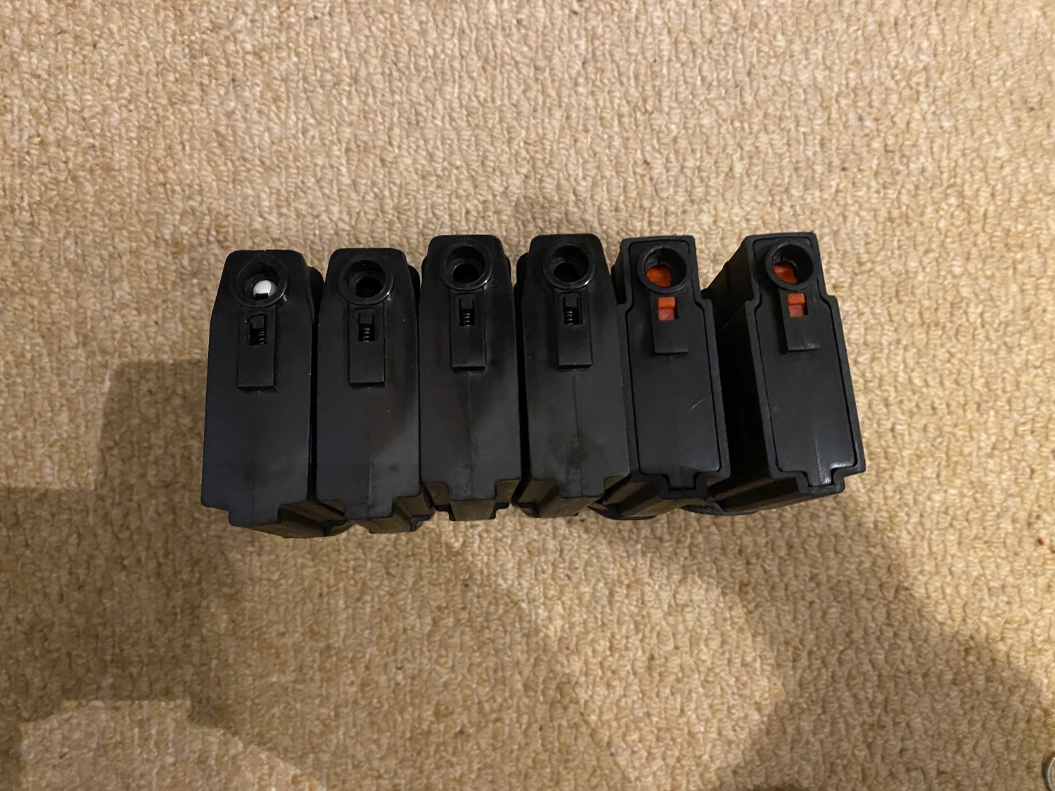 Not sure what brand the other 4 are, they’ve been sat in a box for a while now. The one labeled F jams up sometimes and doesn’t hold many bbs, never taken it apart so likely just dirty. The other 3 worked fine last I tested them but it’s been a long time so it isn’t a guarantee.