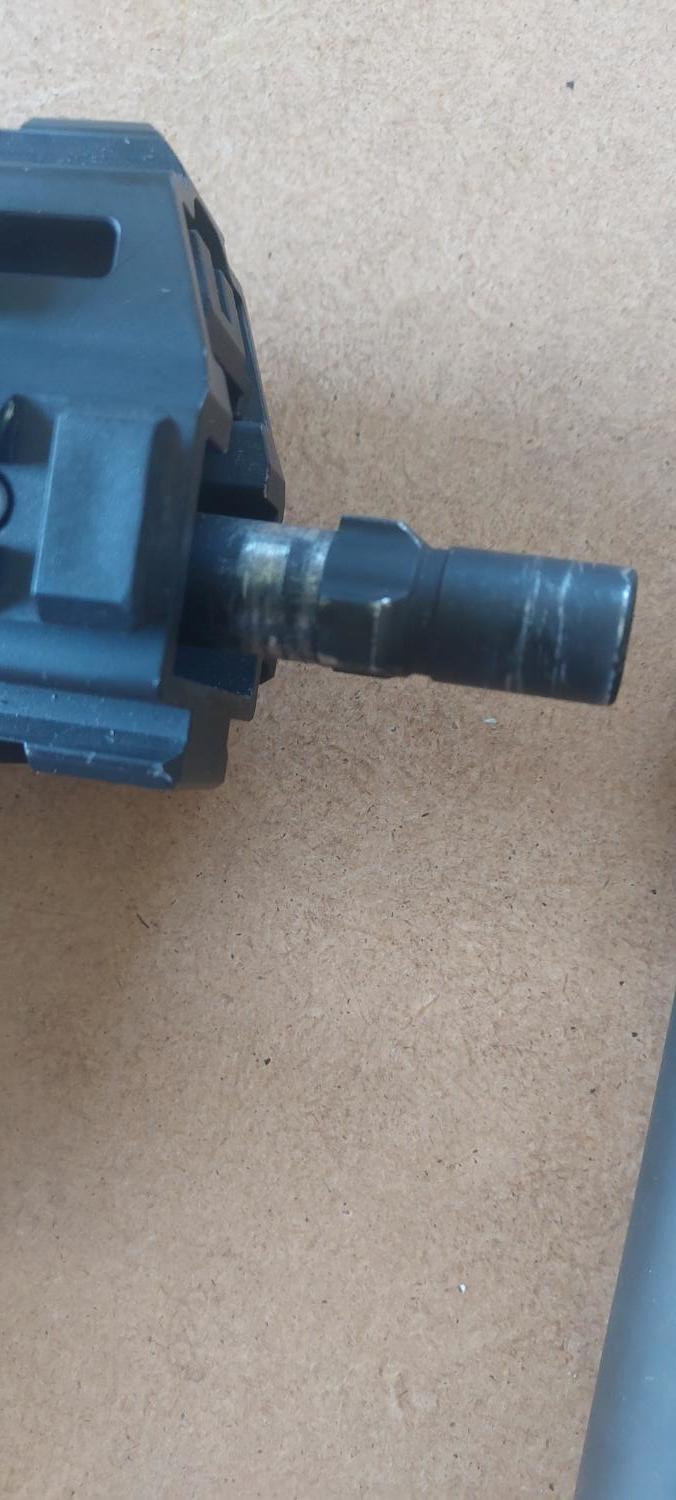 It is missing its front sight and does have marks on it especially the barrel when the faff of a surpressor was not fitted correctly.