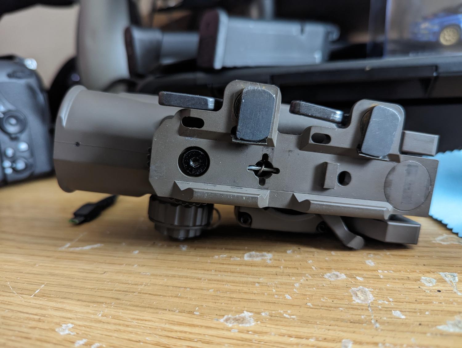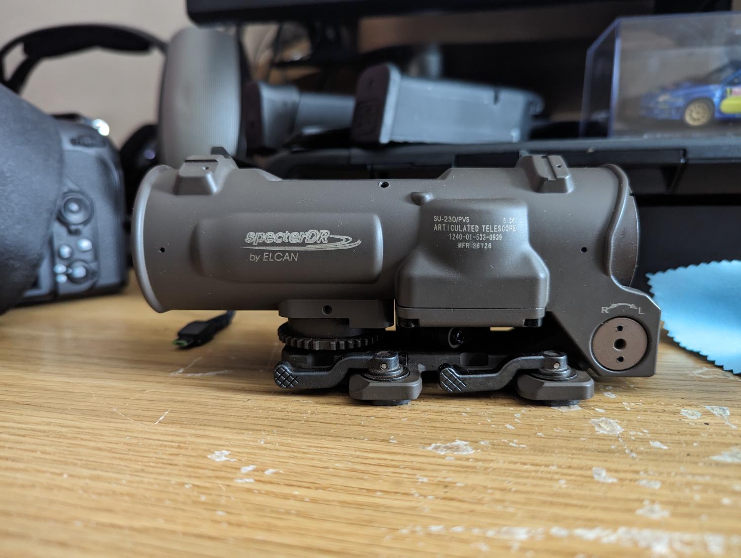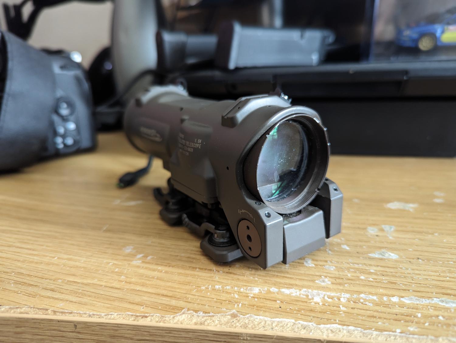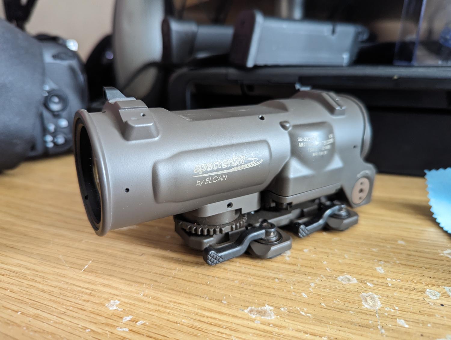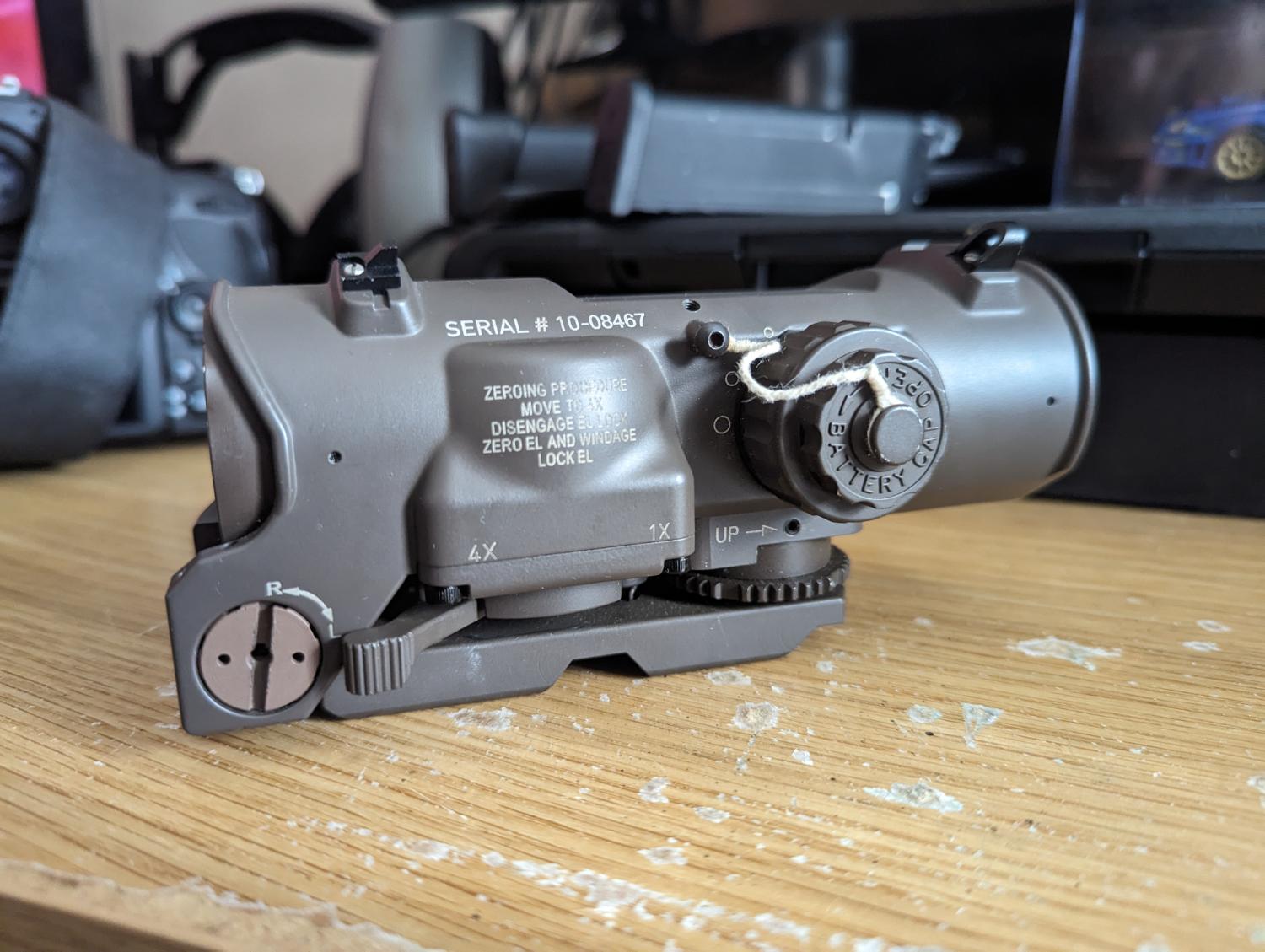 This is an EG Specter with the dual role switching between 1x and 4x. Its about a year old with a few dents and scrapes, but it has held zero without issue and was regularly used on GBBR's with no problems.
