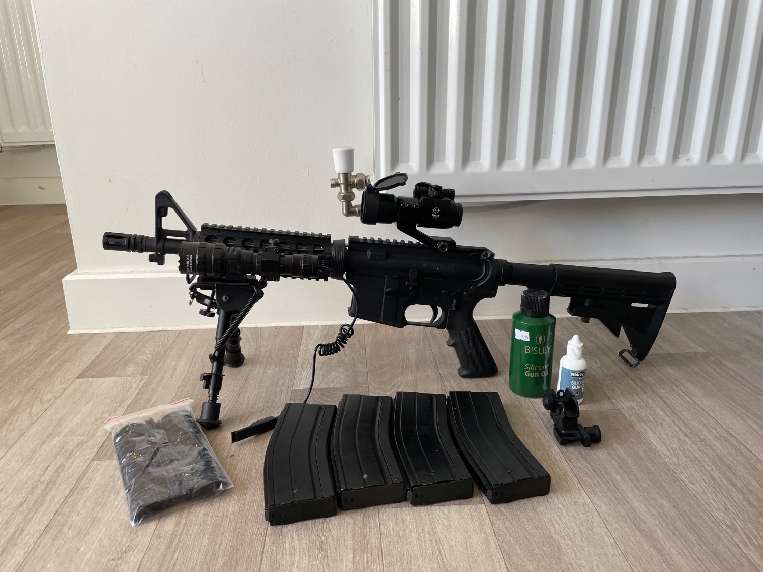 X2 sights, bipod, x4 mags, pressure pad torch,