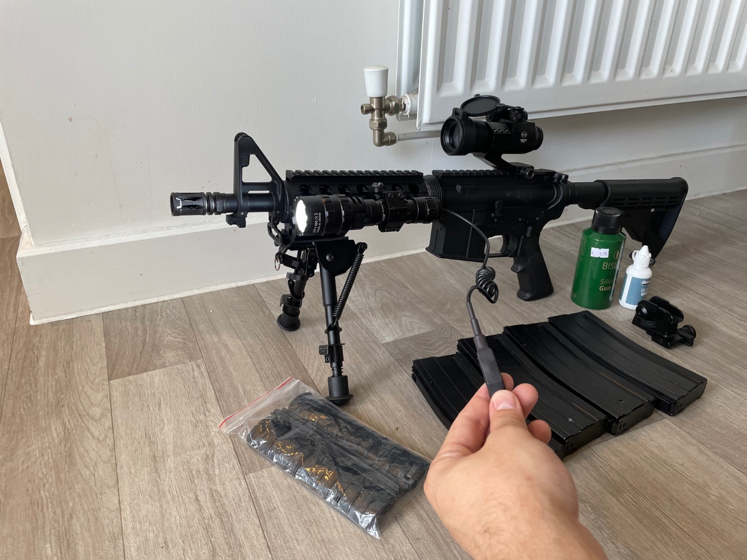Gas blow back m4 rifle, comes with a holographic sight and a bipod. Also comes with an iron sight and foregrip covers. Another attachment that will come with the rifle is the pressure pad torch. Rifle comes with x4 magazines