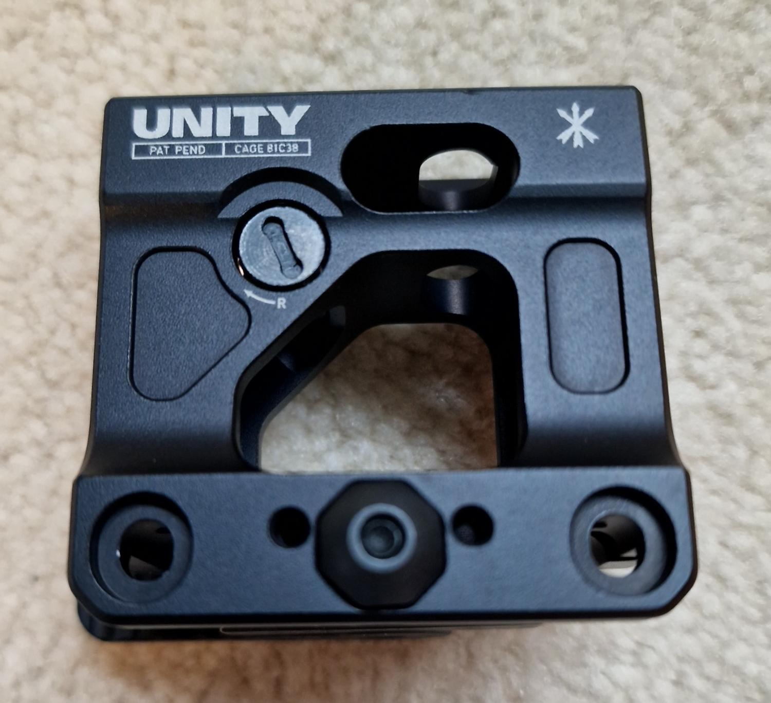 Never used as can be seen in the photos. Genuine Unity Tactical specific quick-detach lever fitted. Original fixed mount hardware included.