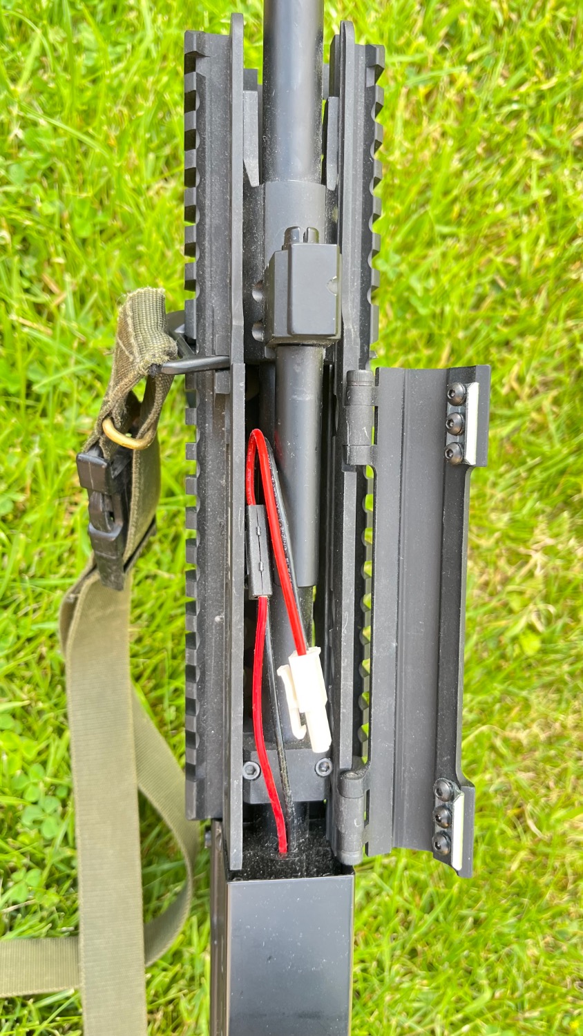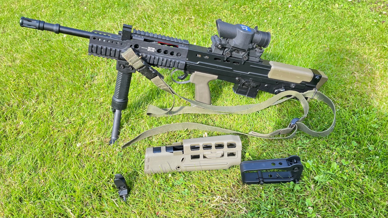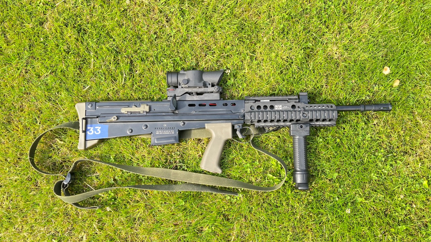 This is an ICS L85A2 which already has a licensed Daniel Defense hand guard on a Mad Bull hand guard adapter. This AEG also includes a replica SUSAT, a bipod grip, an original SA80 sling, and a free Osprey pouch.